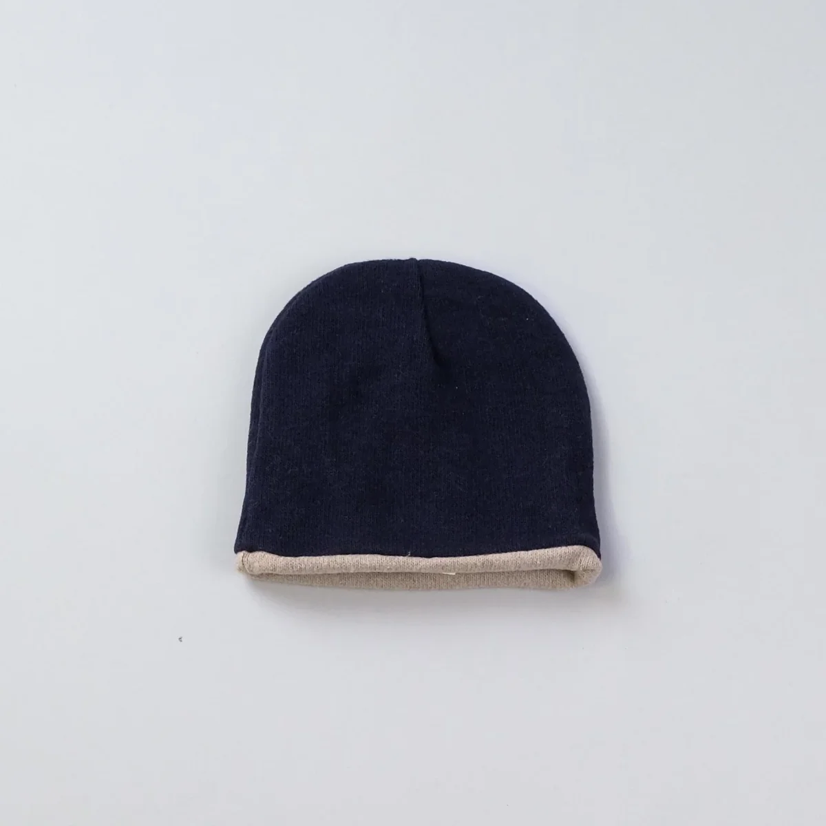 Cappellino reversibile beige da un lato, blu dall’altro.