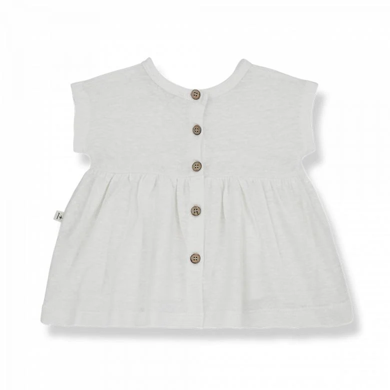 Maglia in lino a manica corta, girocollo, con apertura totale sul retro tramite bottoni in legno.