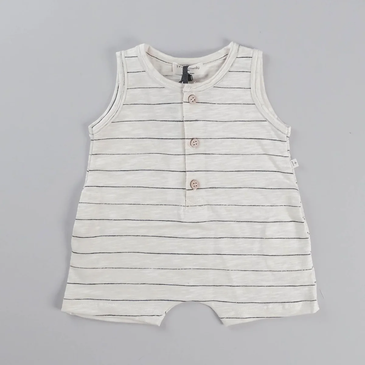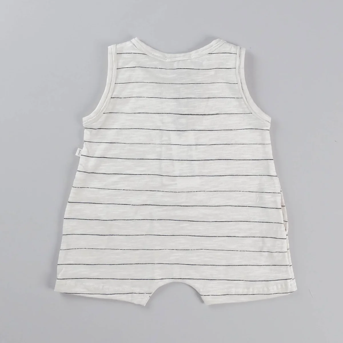 Pagliaccetto senza maniche con scollo tondo, apertura con bottoncini in legno, fantasia a righe. Composizione: 100% cotone