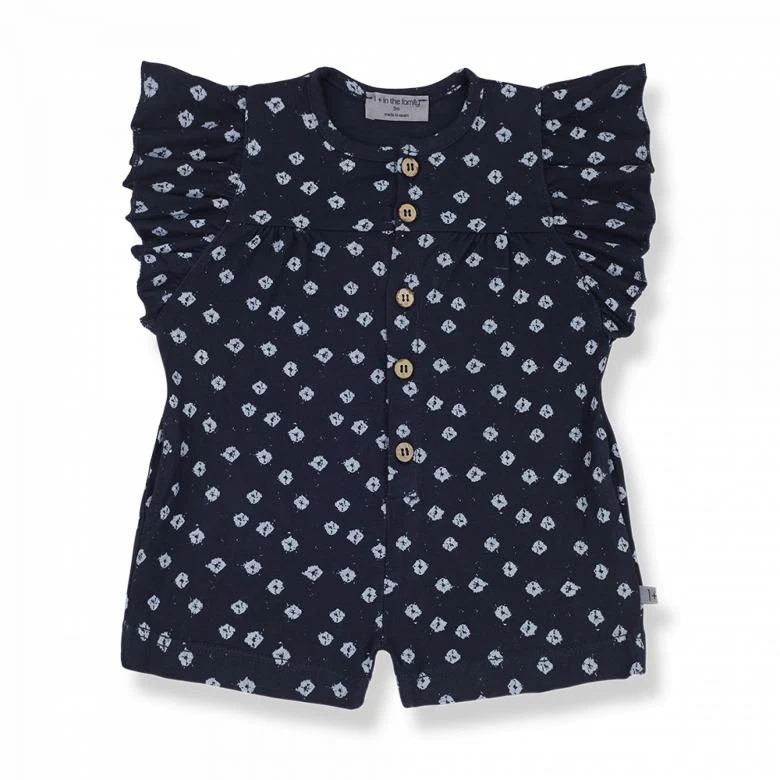 Salopette tuta intera senza manica, con volant, apertura frontale tramite bottoncini in legno, e fantasia a fiorellini all over.