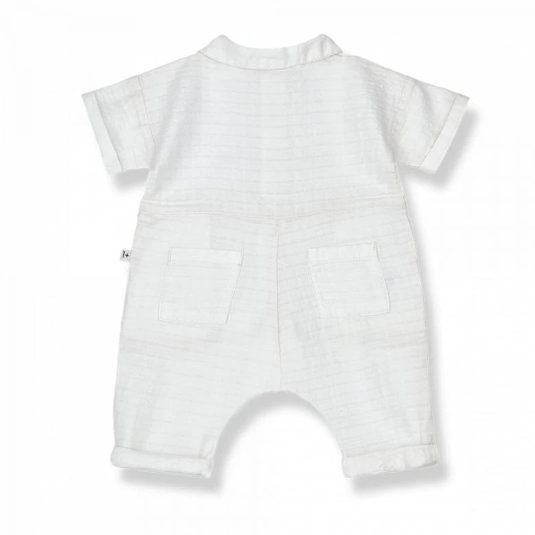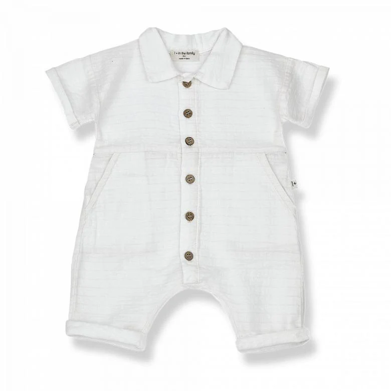 Salopette tuta intera con colletto, apertura frontale tramite bottoncini in legno, manica corta e tasche fronte e retro. Composizione100% co