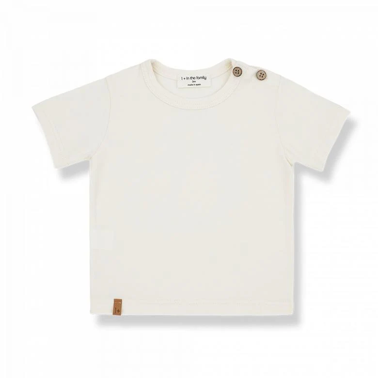 T-shirti in tinta unita, scollo tondo, manica corta e bottoncini di chiusura in legno sulla spalla. Composizione 96% co 4% ea