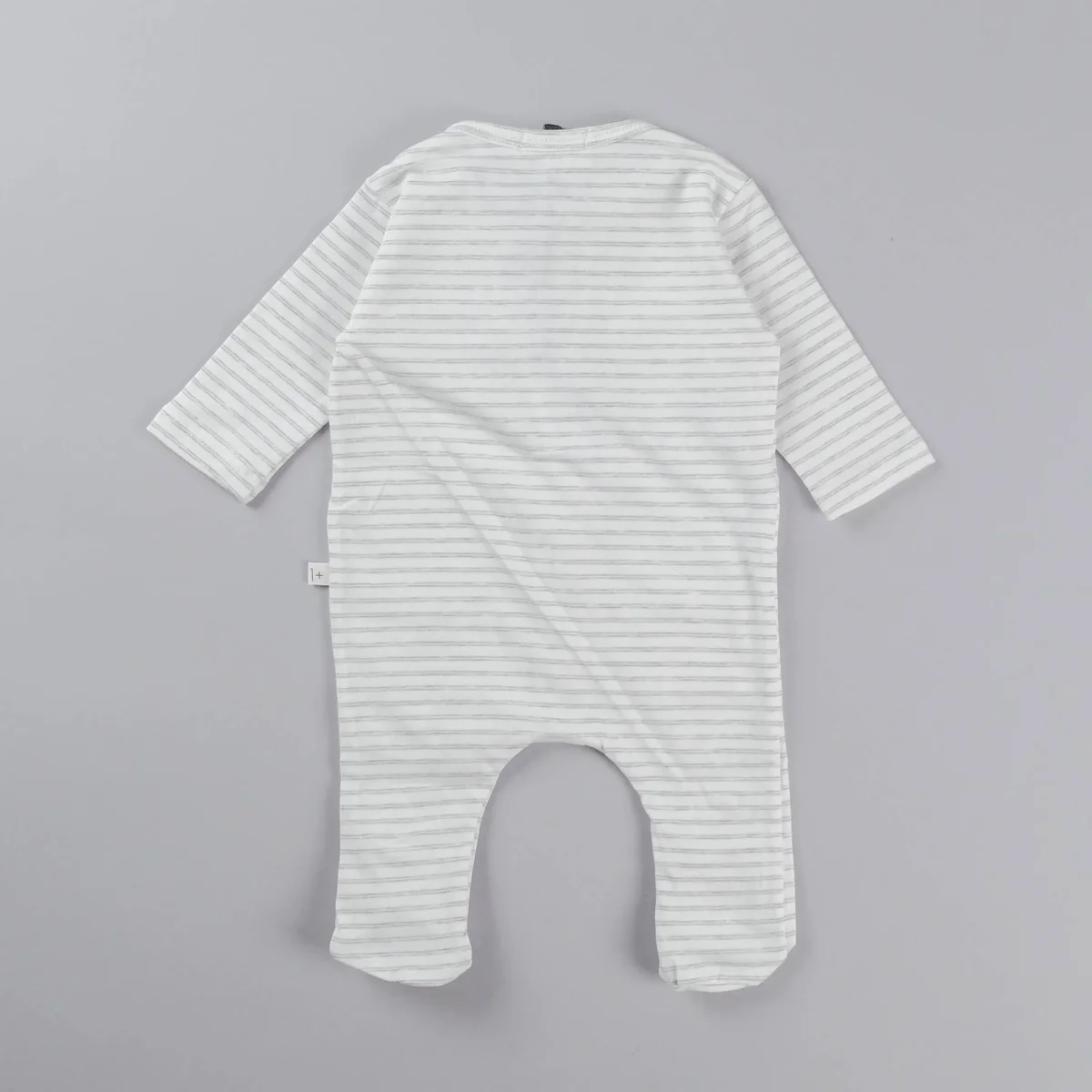 Tutina a manica lunga con piedini, fantasia a righe, apertura frontale con bottoncini in legno, taschine decorative. Composizione: 96% cotone, 4% elastan