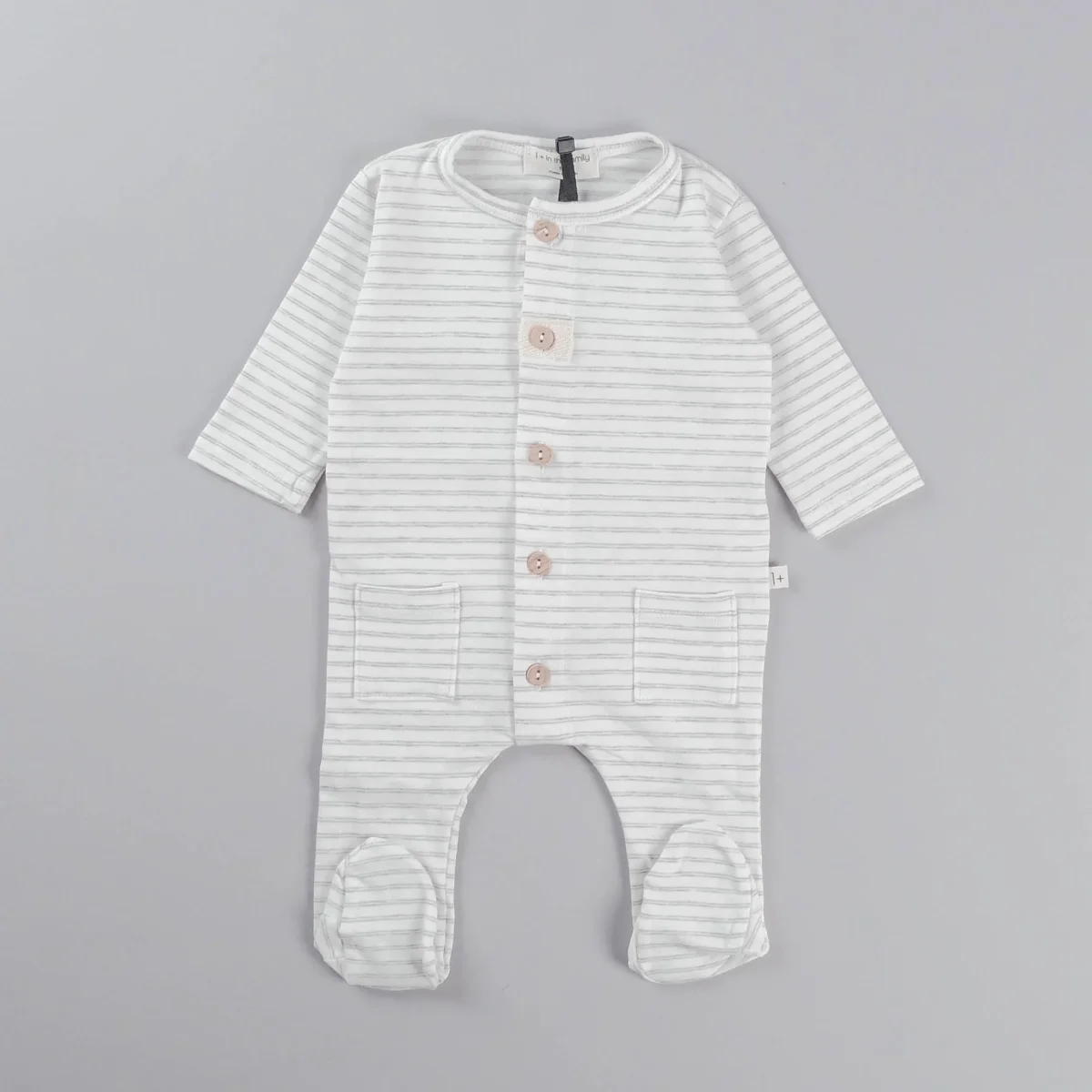 Tutina a manica lunga con piedini, fantasia a righe, apertura frontale con bottoncini in legno, taschine decorative.