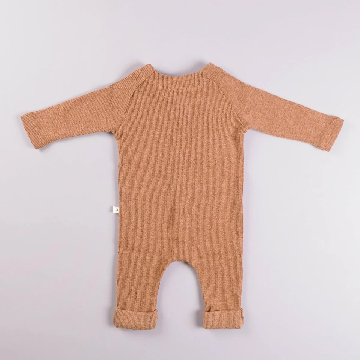 Tutina con manica lunga, apertura frontale tramite bottoncini in legno, toppa decorativa sulle ginocchia, risvolto a fondo gamba.