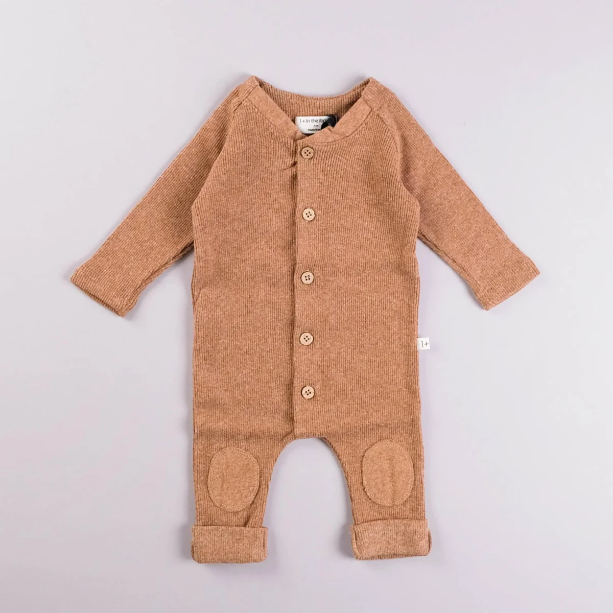 Tutina con manica lunga, apertura frontale tramite bottoncini in legno, toppa decorativa sulle ginocchia, risvolto a fondo gamba.Composizione: 48% cotone, 48% acrilico, 4% elastan