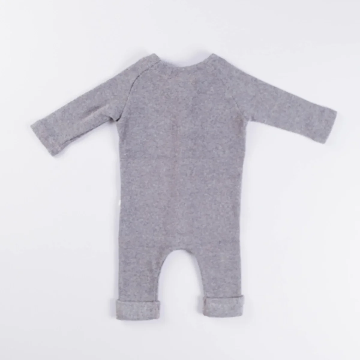 Tutina con manica lunga, apertura frontale tramite bottoncini in legno, toppa decorativa sulle ginocchia, risvolto a fondo gamba.