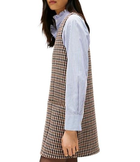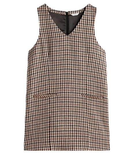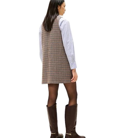 Abito donna decorato da un motivo a quadri all over di ispirazione heritage, nei toni del beige, realizzato in pura lana, dal taglio dritto e lunghezza mini, presenta scollo a V, chiusura con zip, smanicato con due tasche a filetto sul davanti. Vestibilitร  rilassata.