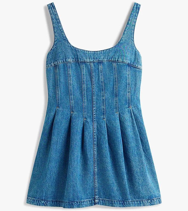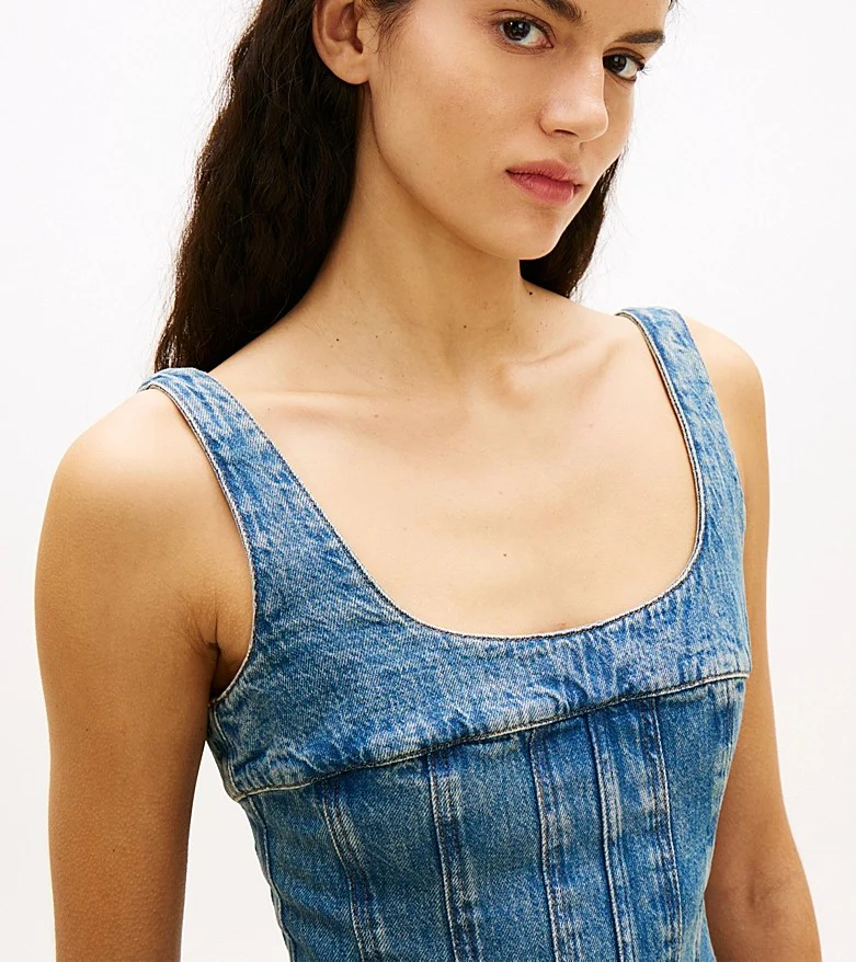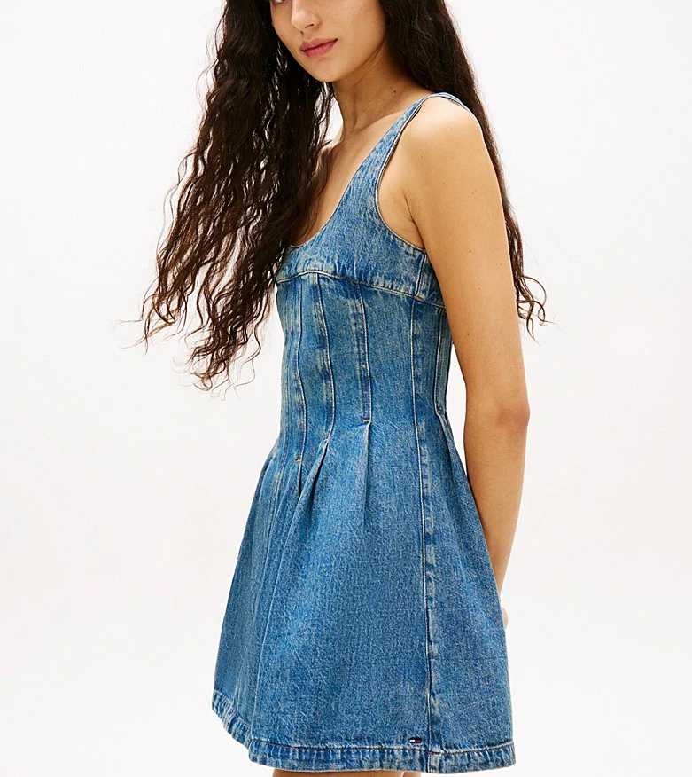 Abito corto donna dalla vestibilitร slim, in denim rigido con originali scollature quadrate e impreziosito dalle pieghe sul davanti e sul retro, spalline sottili, chiusura con zip a vista sul retro e dettagli arricciati.