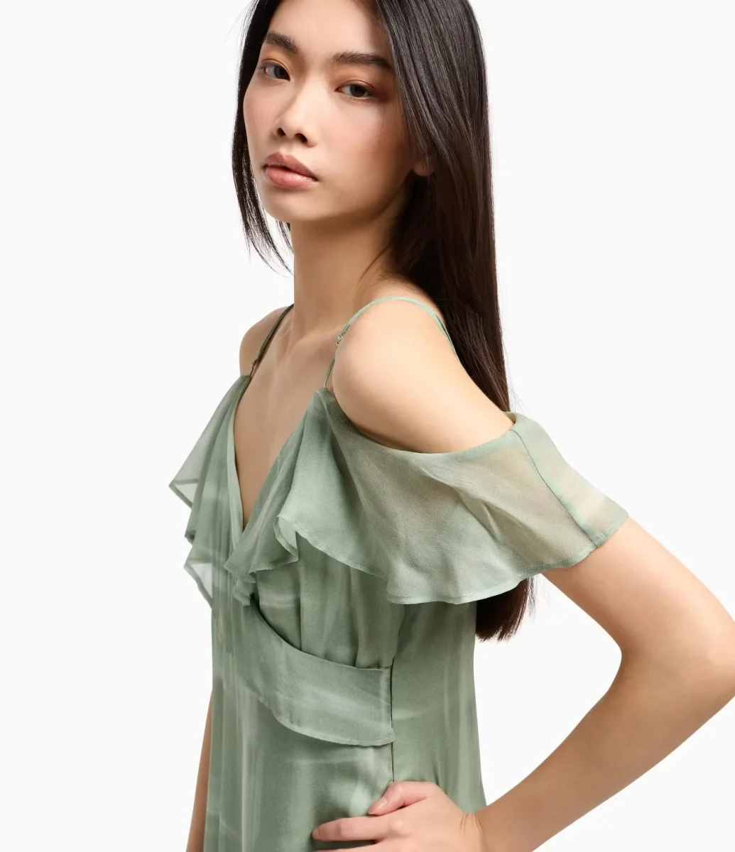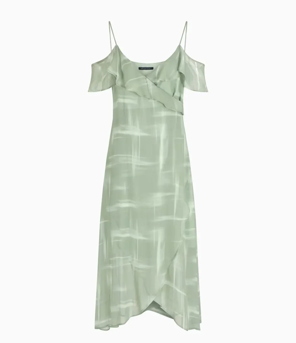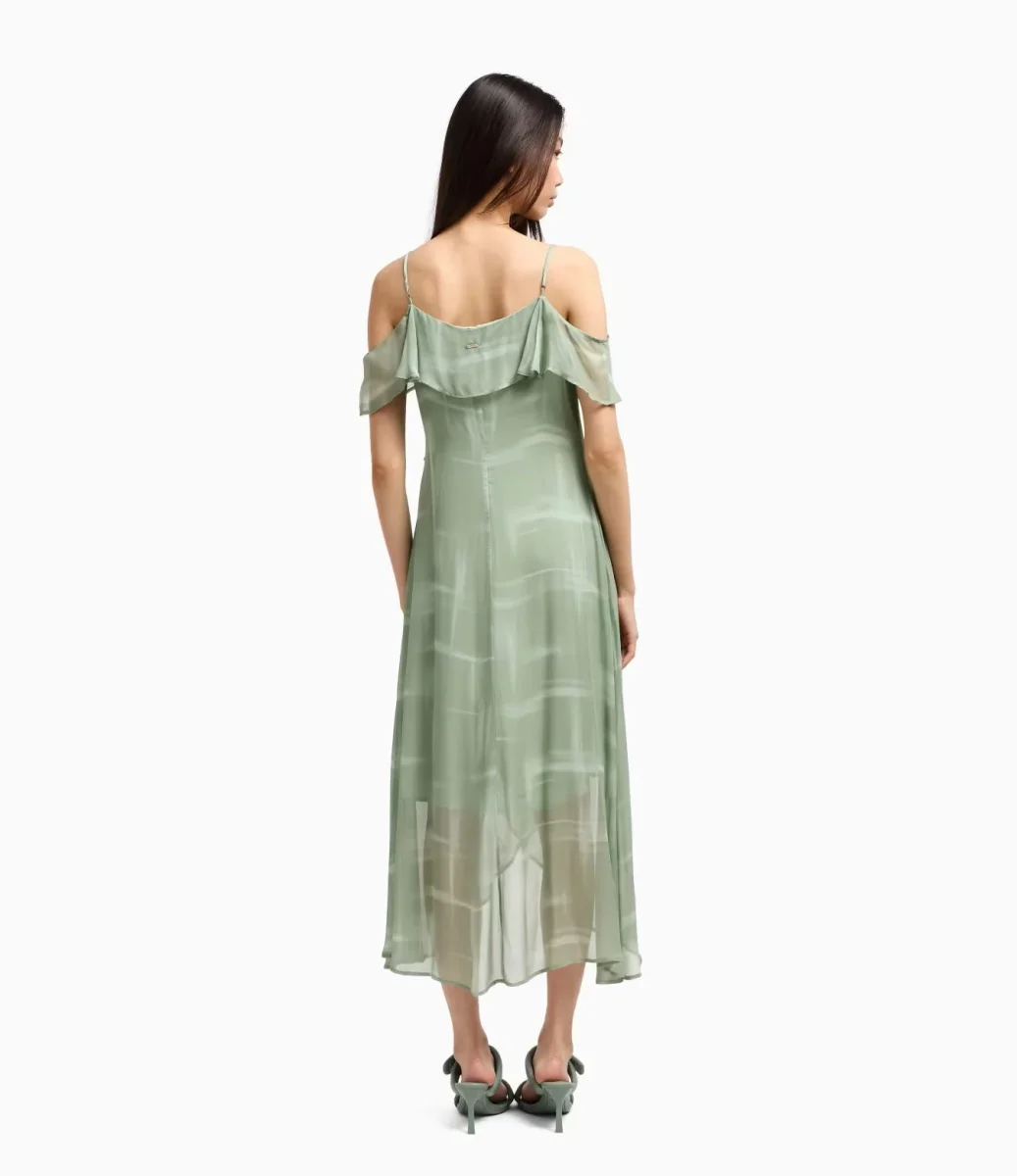 Abito lungo asimmetrico donna verde acqua in chiffon di viscosa presenta una fantasia astratta che aggiunge un tocco unico ed elegante. Le spalline sottili e le maniche a volant aggiungono un dettaglio romantico e fluido. La scollatura a V esalta la figura, mentre il design asimmetrico crea movimento. Perfetto per le serate speciali, unisce stile sofisticato e femminilitร .