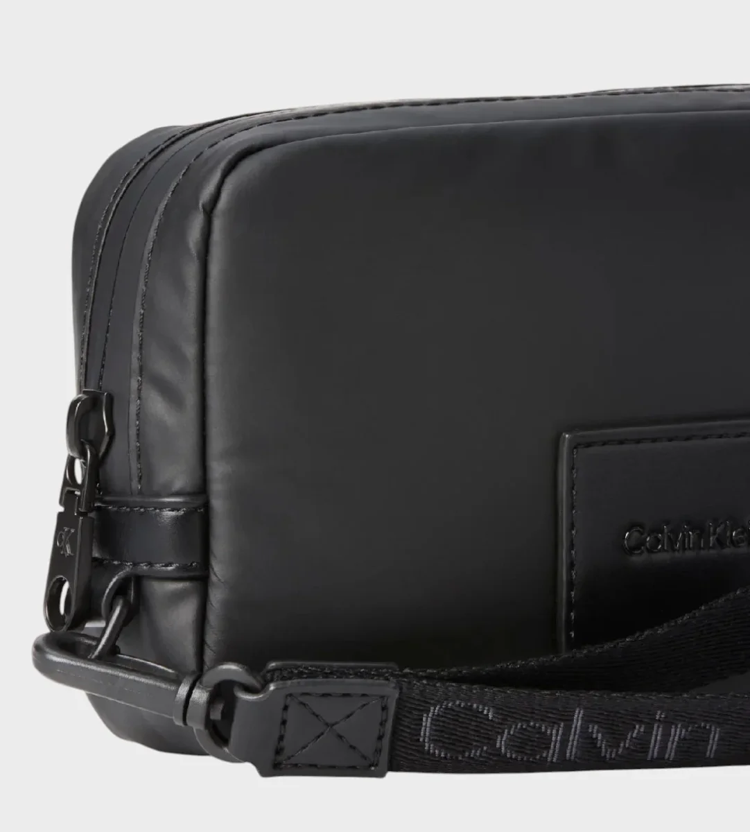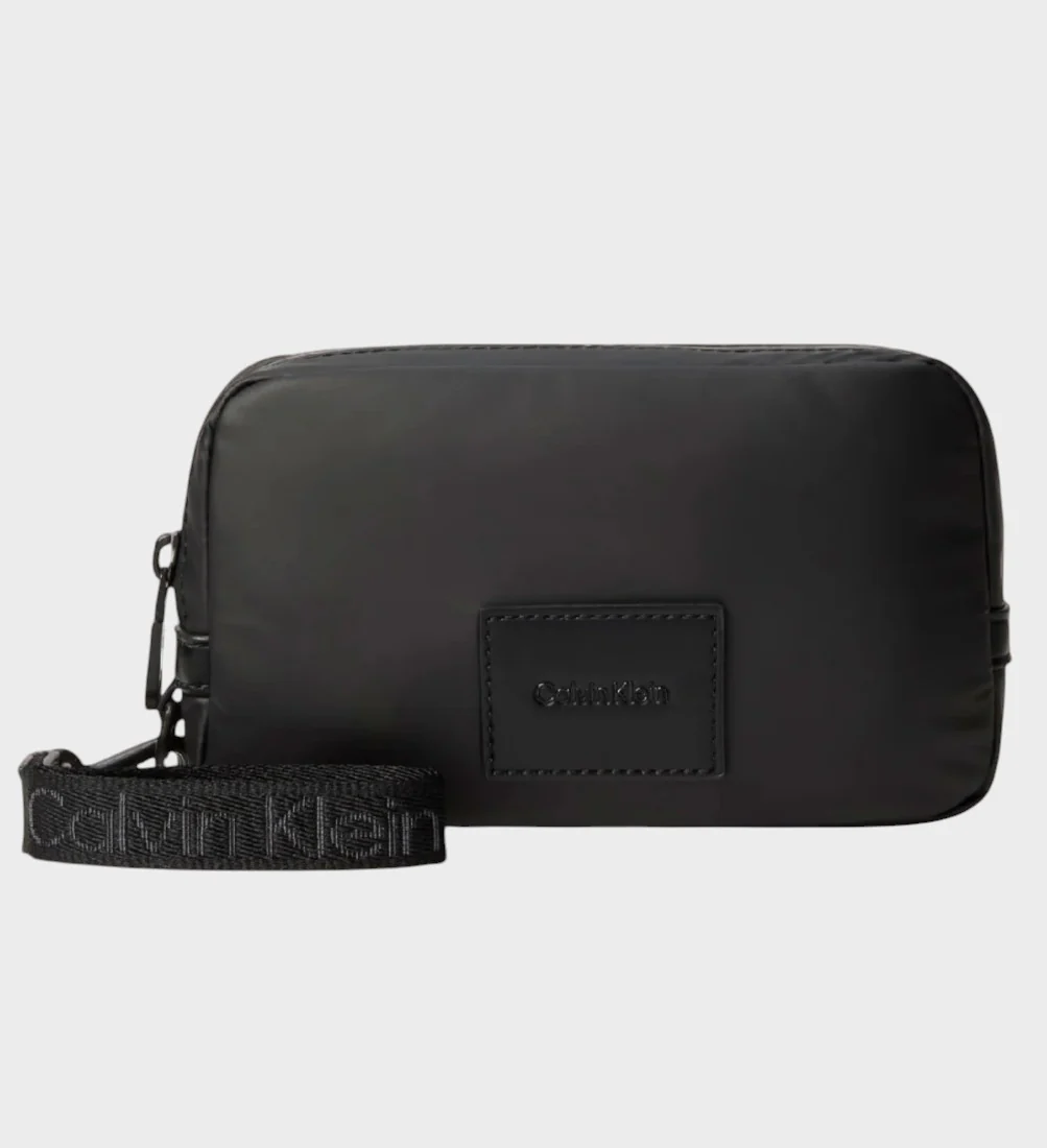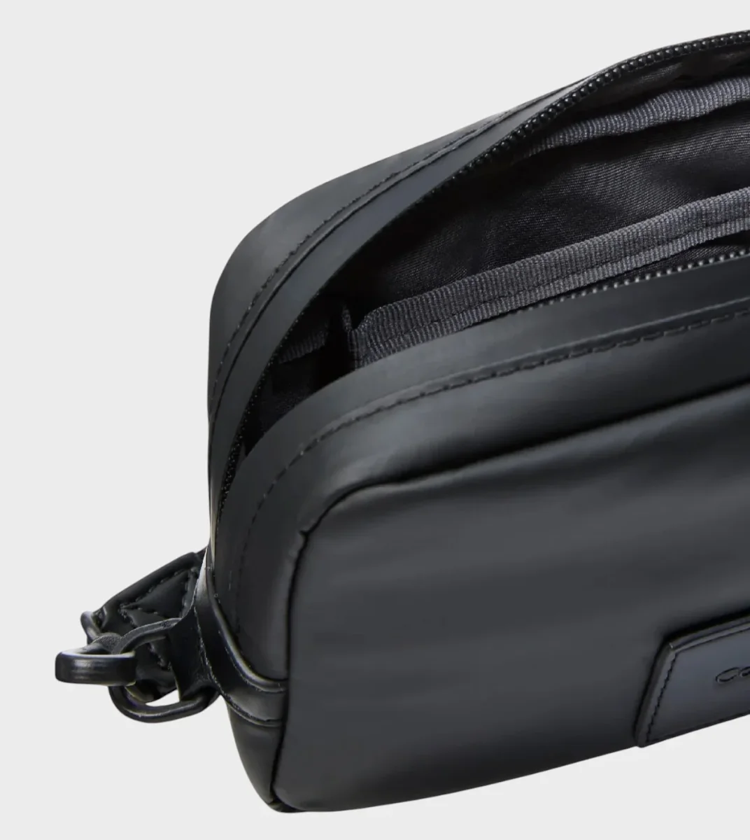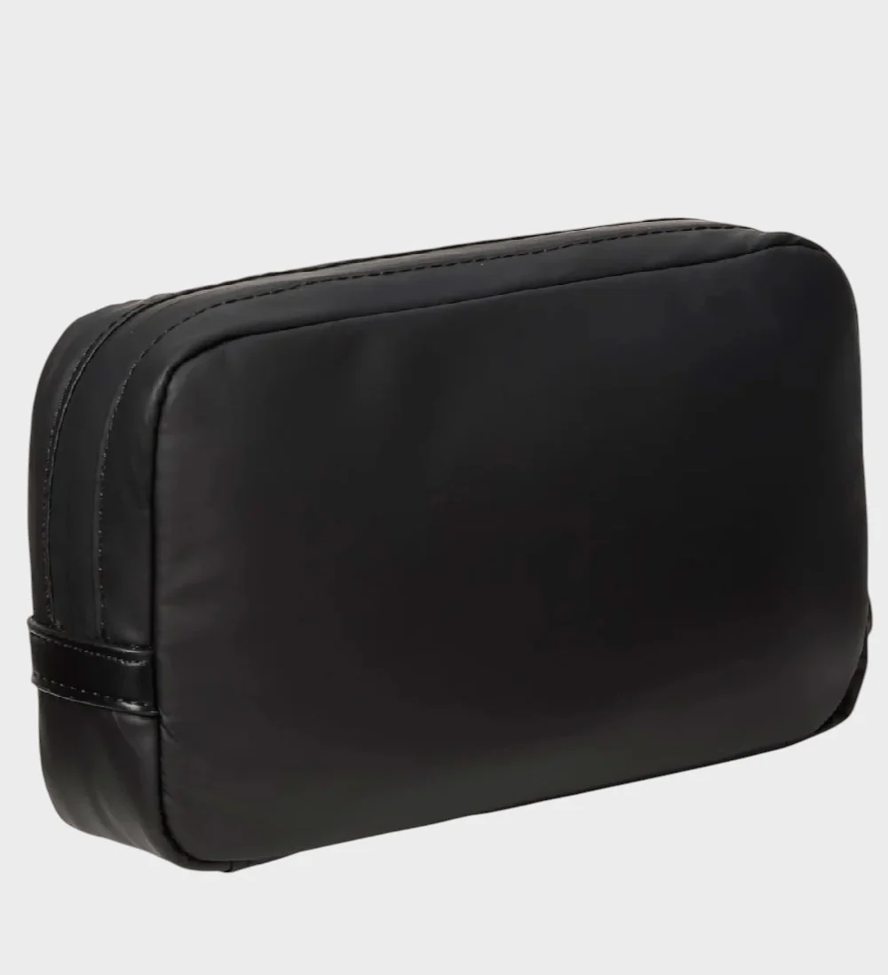 Beauty case nero realizzato in morbida similpelle, tracolla staccabile, chiusura con cerniera e tasca interna a fessura, logo sul davanti e cinturino logato.