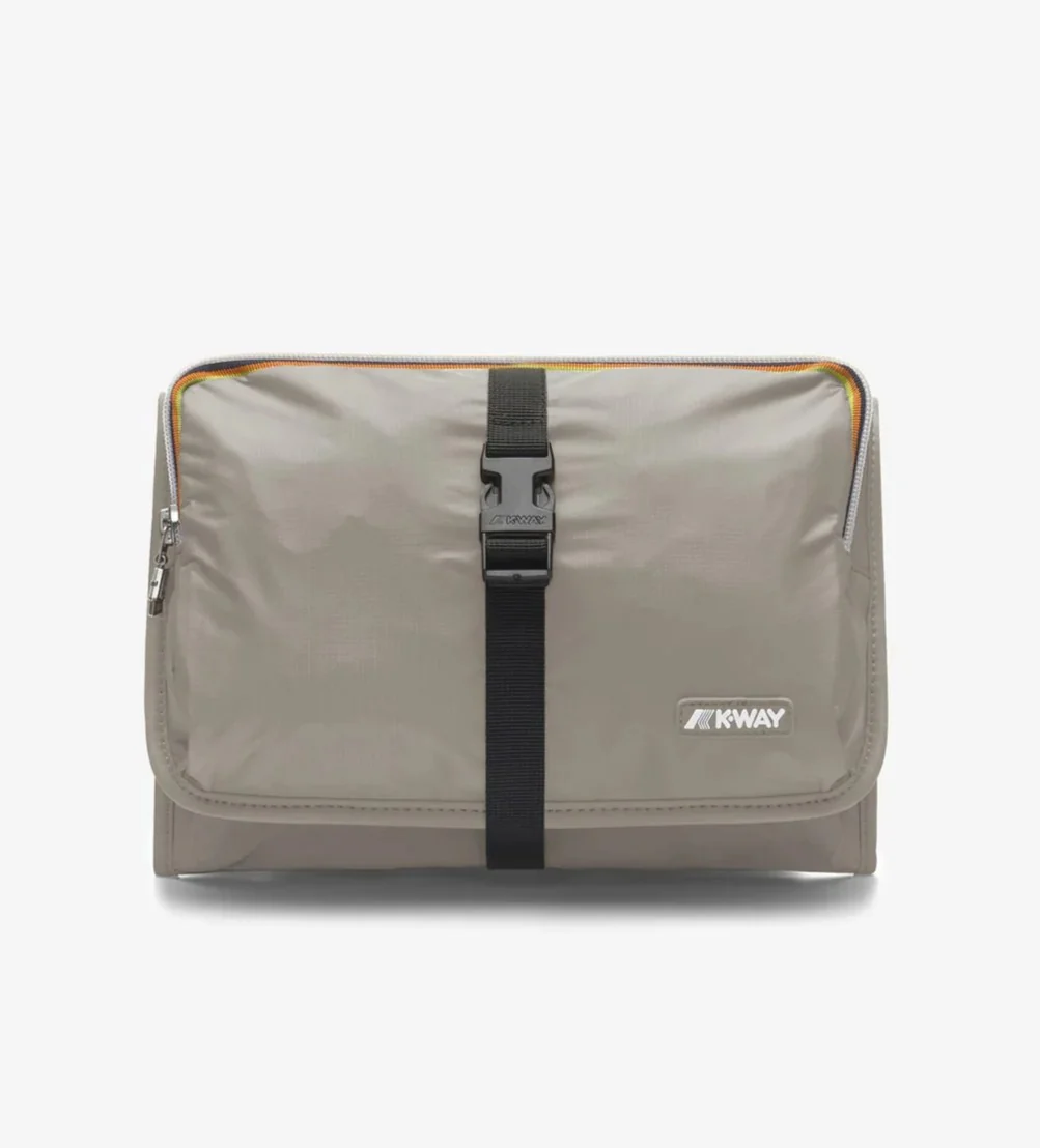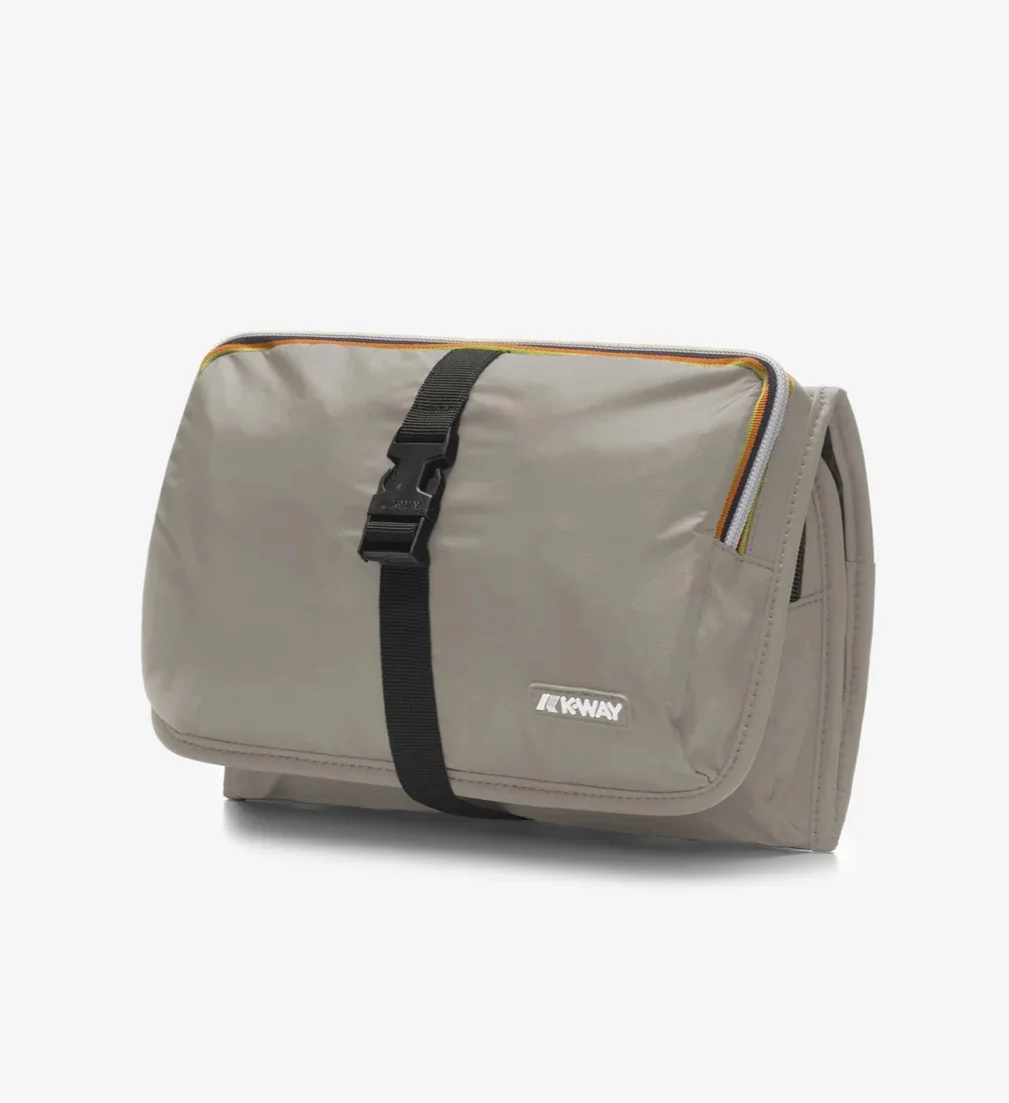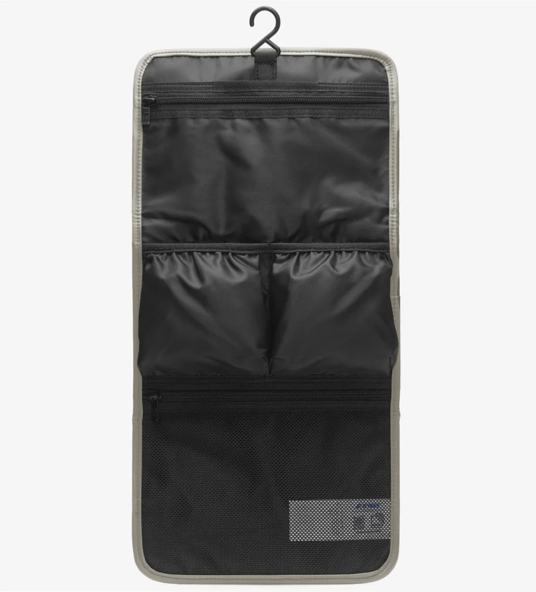 Beauty case unisex verde in nylon, impermeabile e idrorepellente, progettato per essere appeso con dobbia zip multicolor, provvisto di tasca esterna con zip, due tasche interne in rete, logo bianco in silicone. Dimensioni: 15cm x 25cm x 5cm.