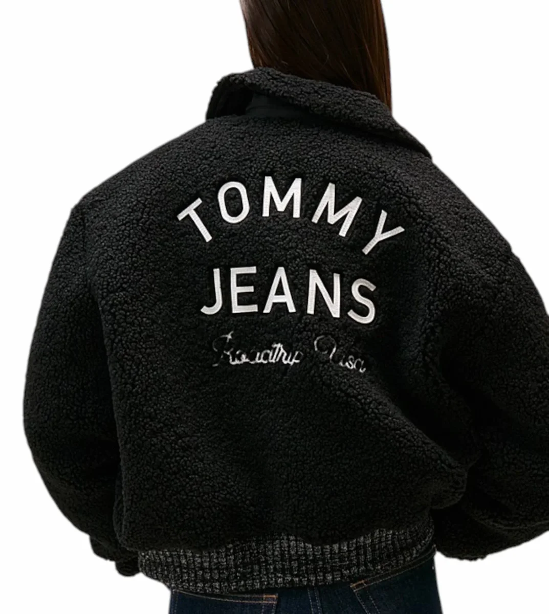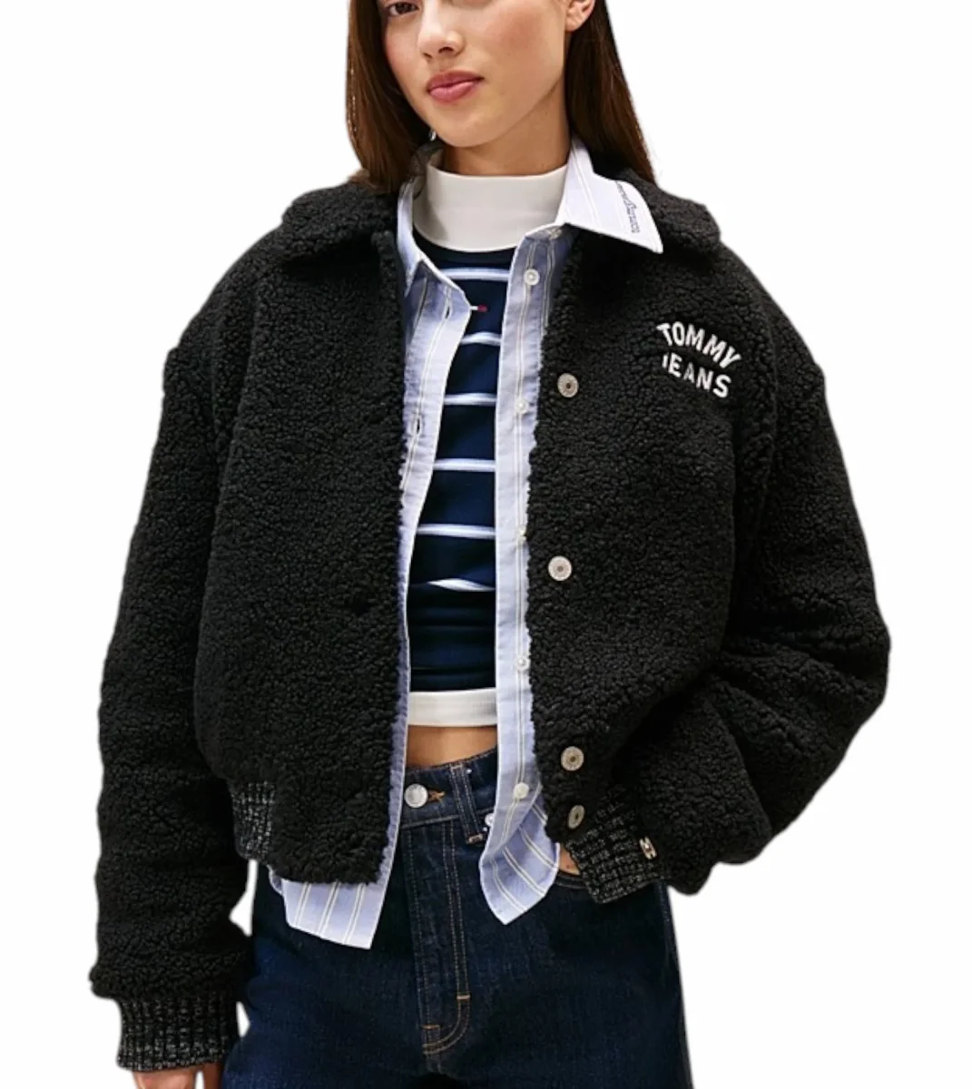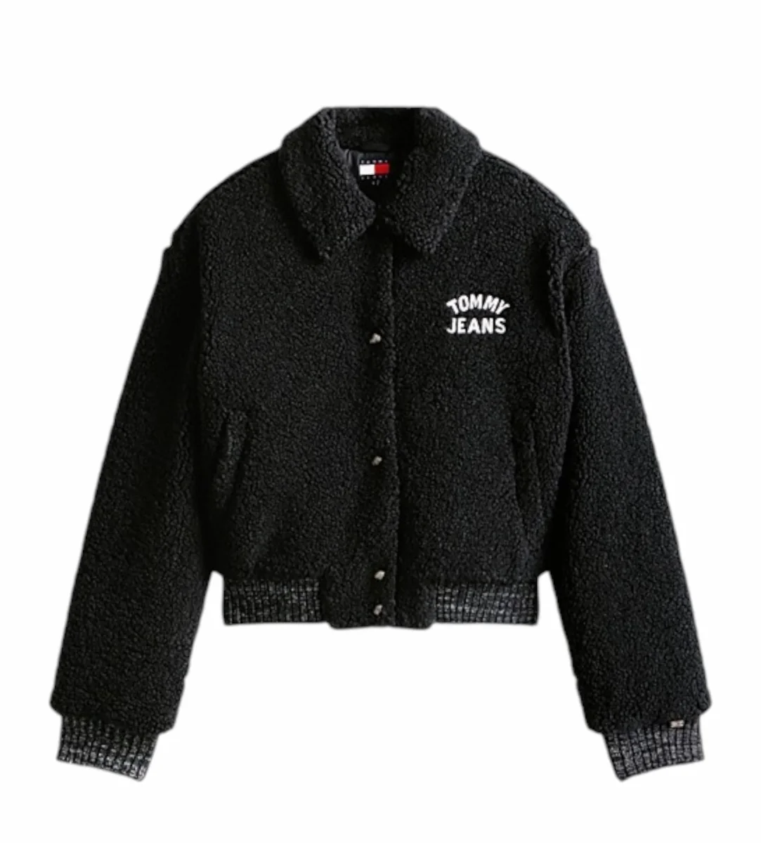 Bomber donna nero in sherpa, caratterizzato dalla comoda chiusura con bottoni a pressione e dal design in perfetto stile college; colletto semifrancese e fondo e polsini a coste, con logo ricamato sul petto e sul retro. Vestibilitร rilassata, spalle leggermente scese.