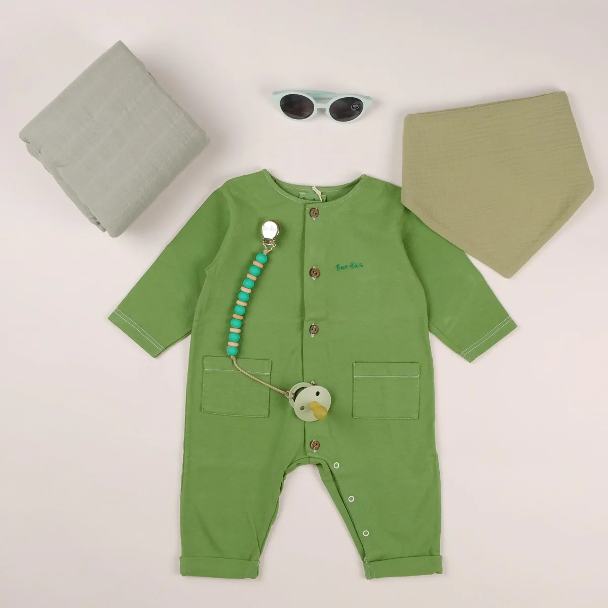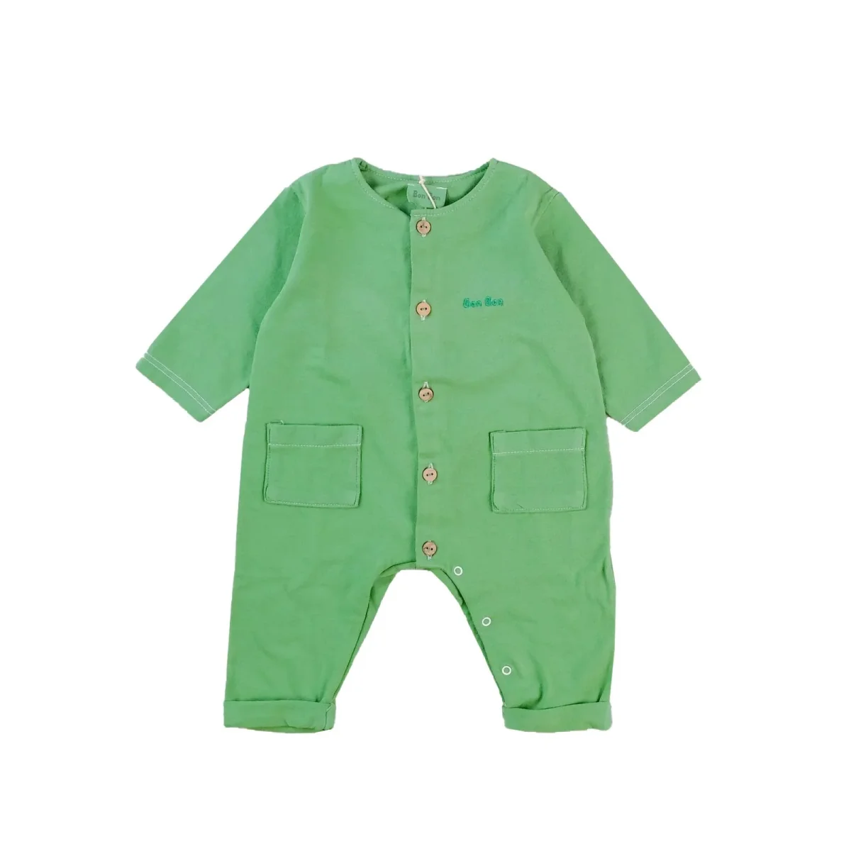 Tutina in cotone con manica lunga, apertura frontale tramite bottoncini in legno, apertura sotto tramite bottoncini a pressione, taschine e logo ricamato.