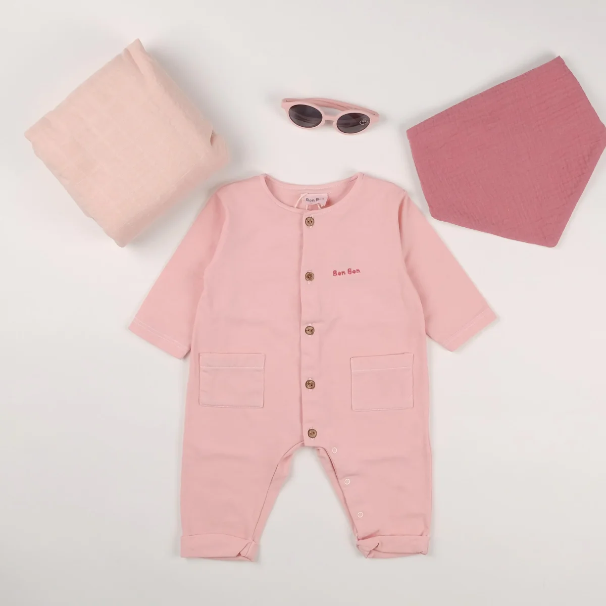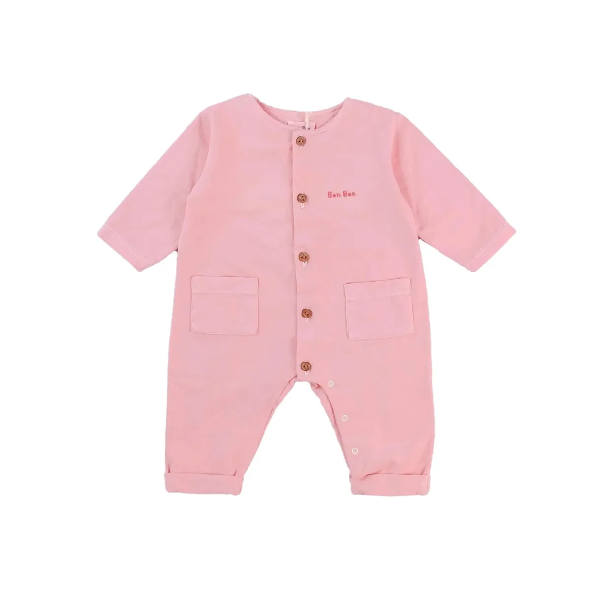 Tutina in cotone con manica lunga, apertura frontale tramite bottoncini in legno, apertura sotto tramite bottoncini a pressione, taschine e logo ricamato.