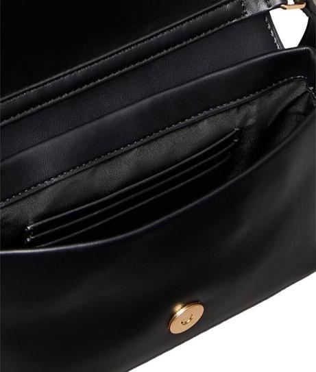 Borsa a tracolla donna nera in ecopelle liscia, con tracolla incrociata regolabile, chiusura con aletta magnetica, tre tasche interne per carte di credito, monogramma stampato sul davanti.