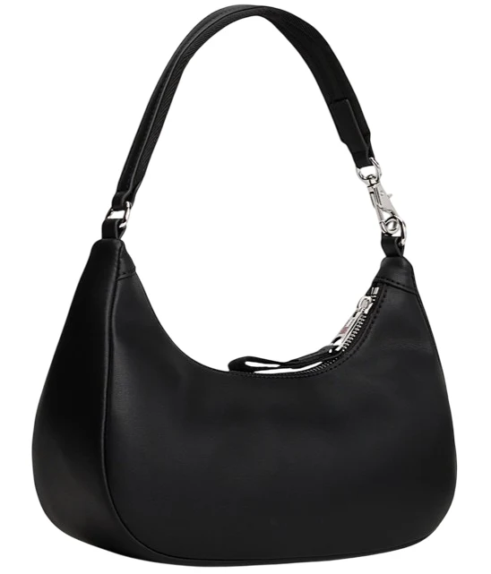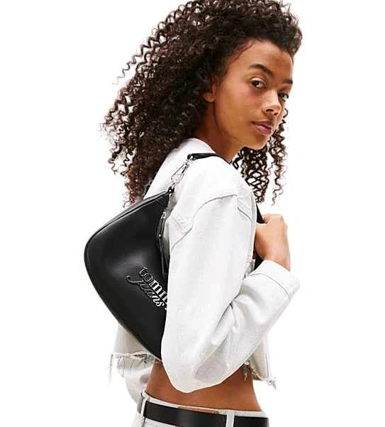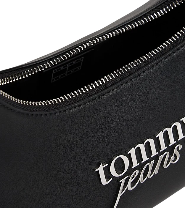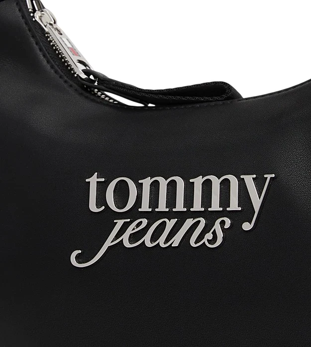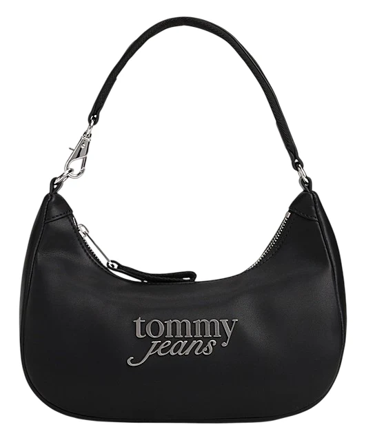 Borsa donna nera in simil pelle caratterizzata da una raffinata texture liscia e l’elegante logo serif in corsivo in metallo sul davanti. Presenta chiusura con zip, tracolla, scomparto principale e tasca interna con zip, distintivo Tommy impresso sul tiretto della zip.