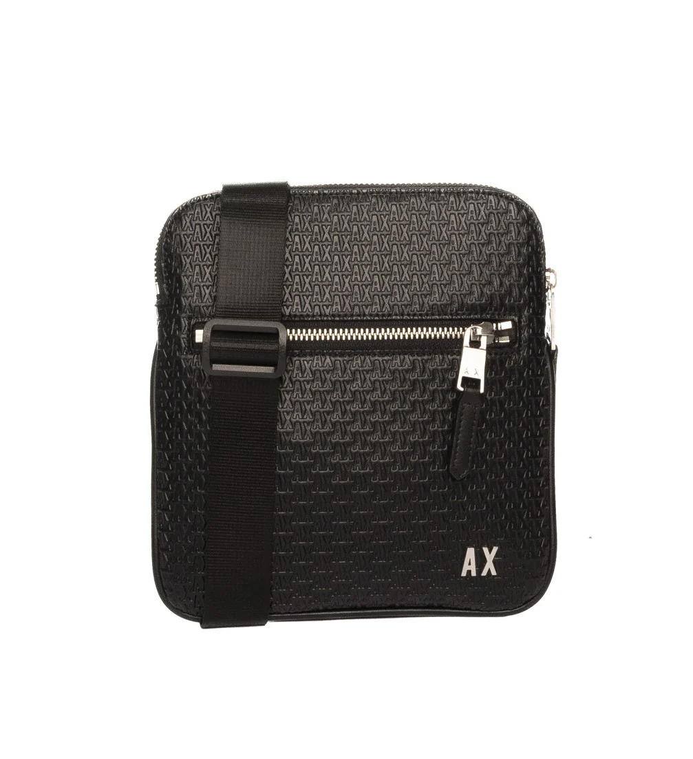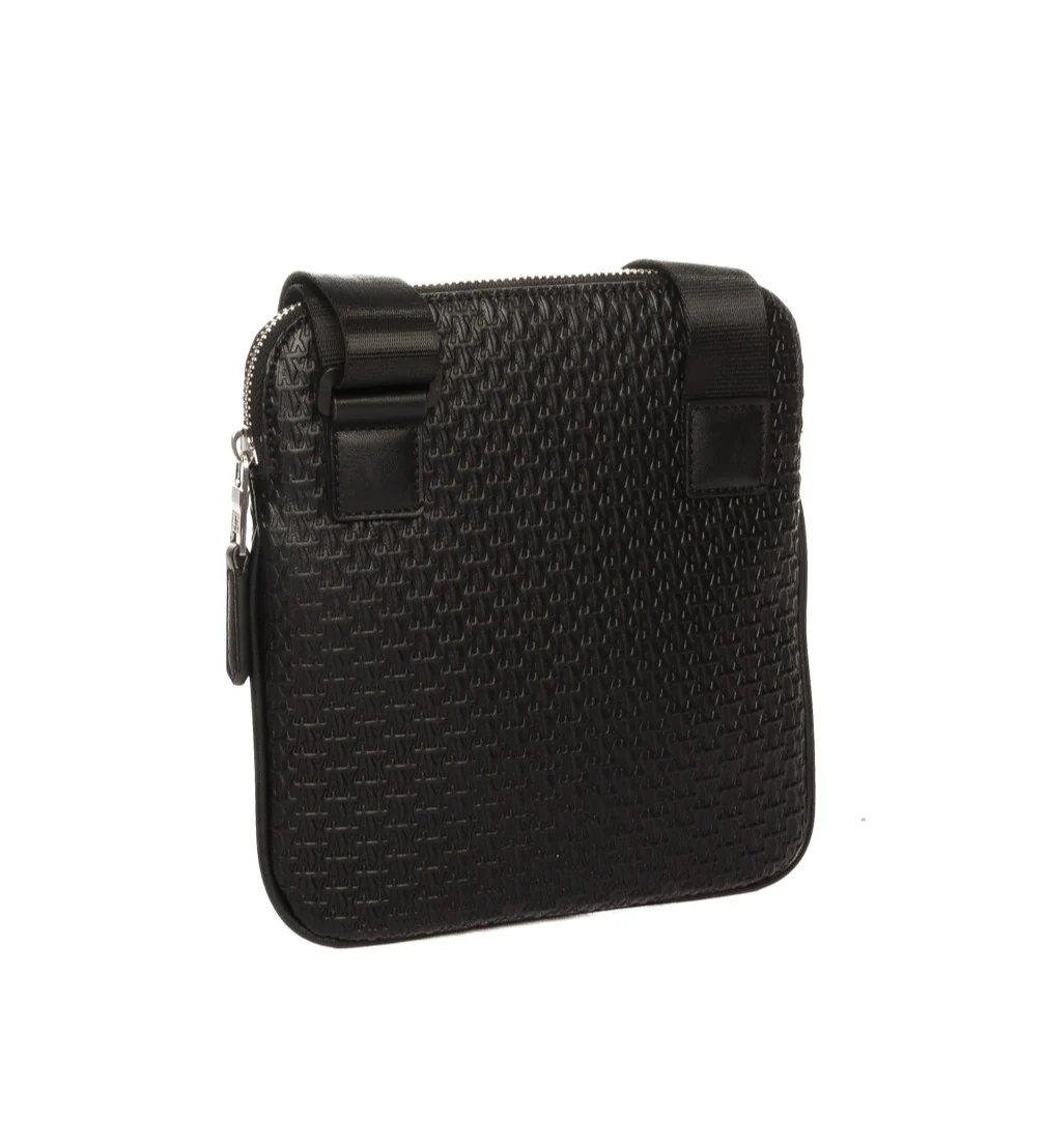 Borsa a tracolla uomo nera realizzata in materiale resistente con lavorazione a rilievo e logo all-over, presenta chiusura a zip, tasca esterna con zip e tracolla regolabile.