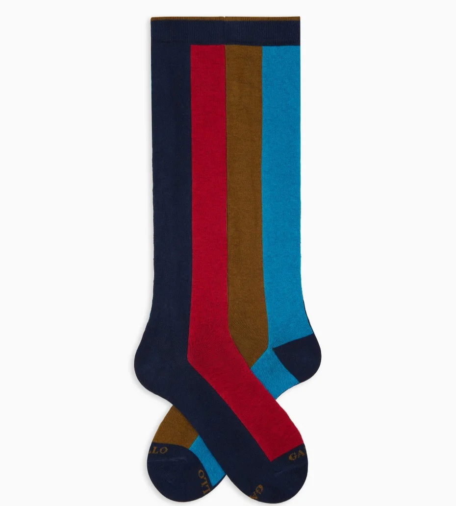 Calze lunghe uomo a righe verticali colorate, in cotone di alta qualità, ideali per un look distintivo e confortevole. La fantasia iconica Gallo valorizza ogni passo.