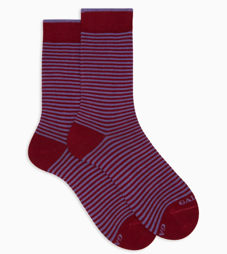 Calzini corti da donna realizzati in Italia in morbidissimo cotone. L’iconico motivo a righe Windsor sul bordeaux rende questi calzini immediatamente visibili e perfetti per qualsiasi look. Il logo Gallo ricamato sulla punta crea un contrasto.