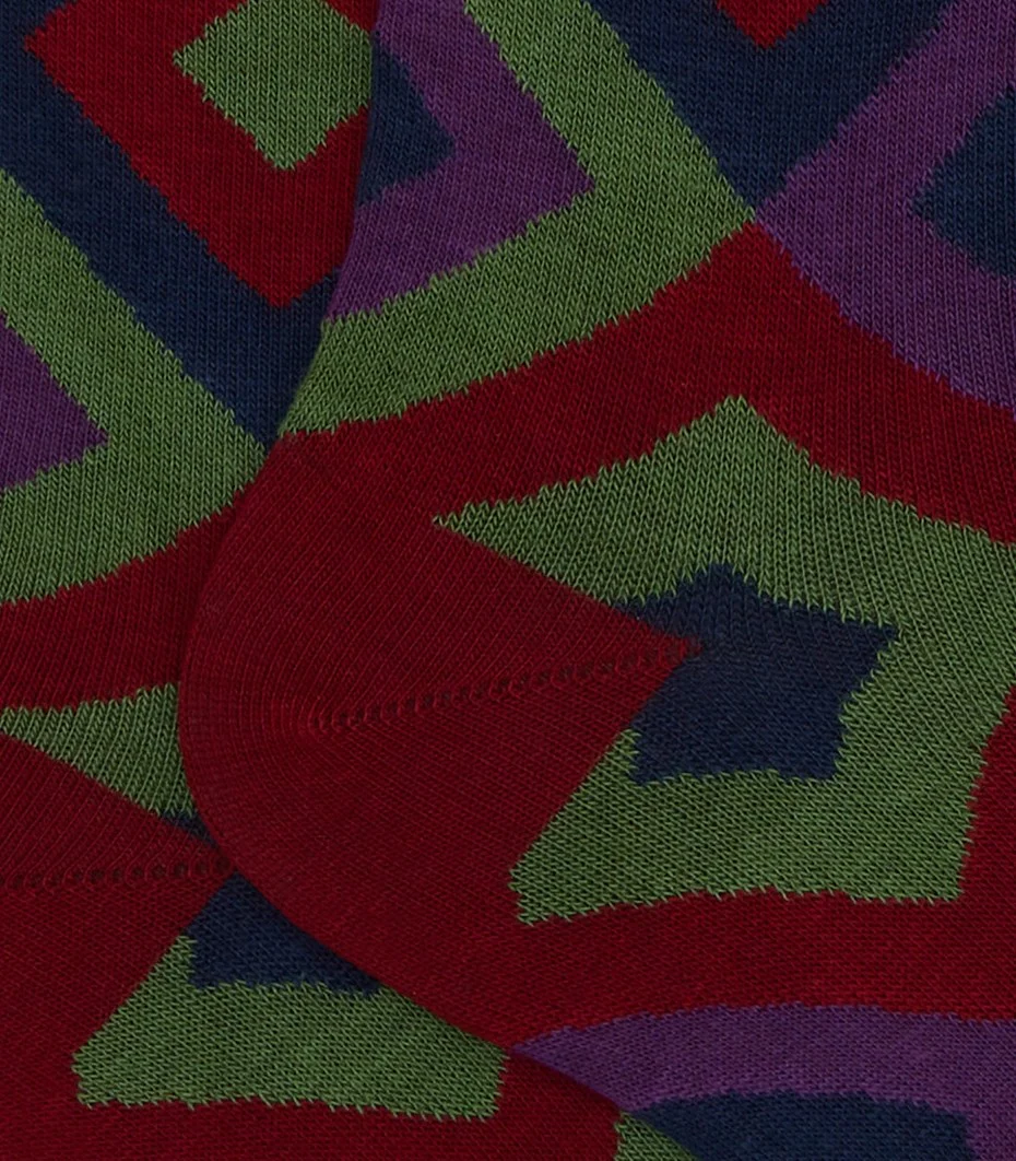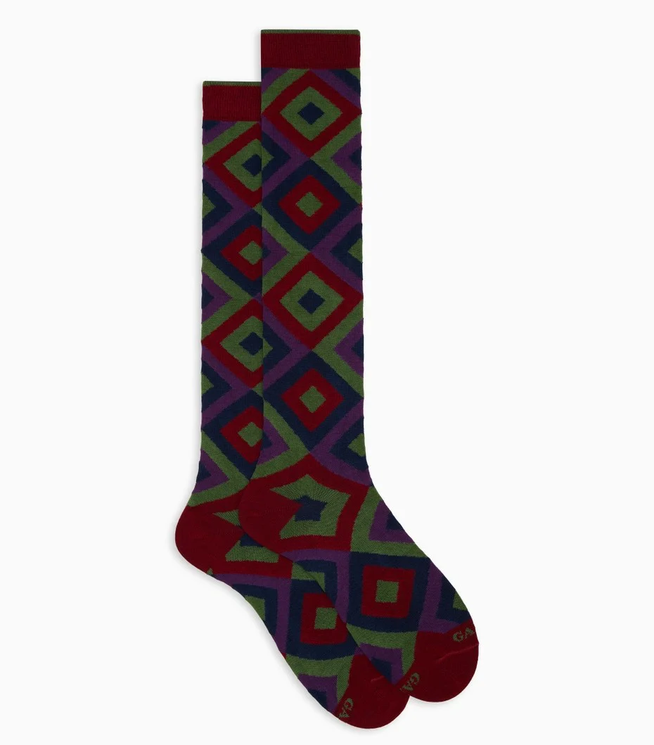 Calze lunghe da uomo in morbido cotone color bordeaux, decorate con un’elegante fantasia a rombi concentrici. Un accessorio distintivo che unisce comfort e originalitร .