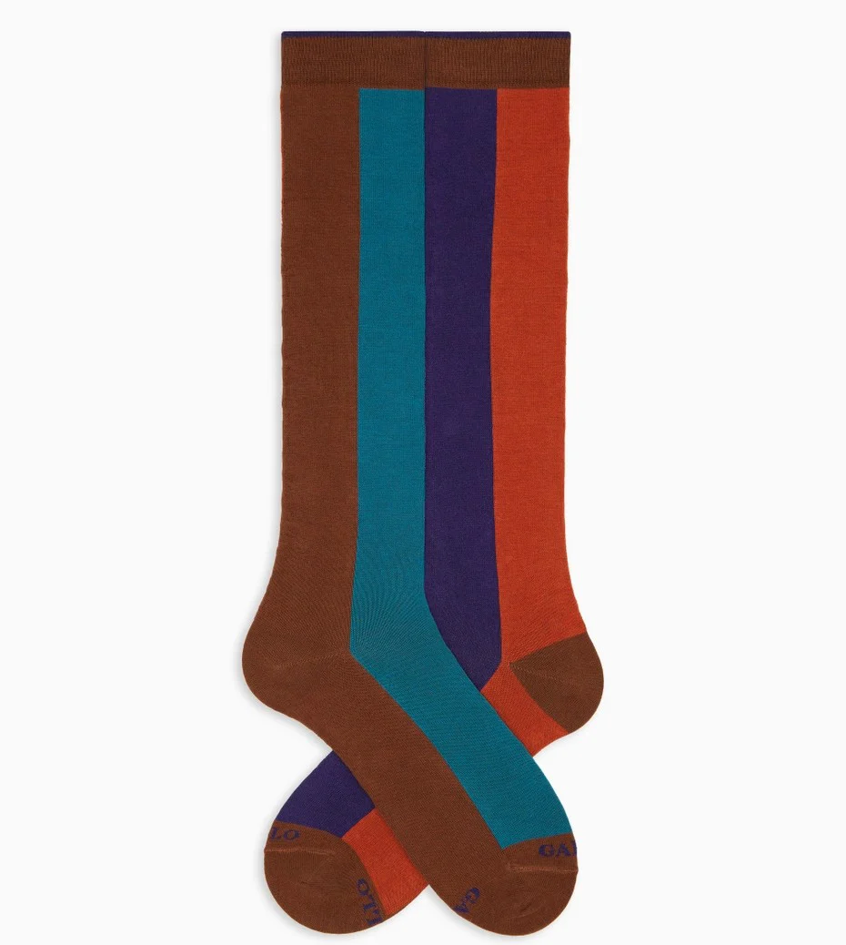 Calze lunghe uomo marrone a righe verticali colorate, in cotone di alta qualitร , ideali per un look distintivo e confortevole. La fantasia iconica Gallo valorizza ogni passo.