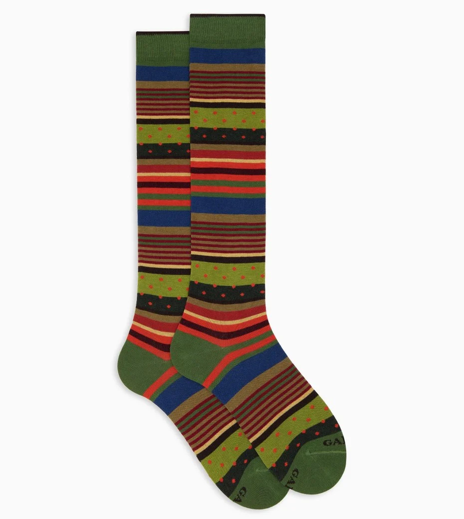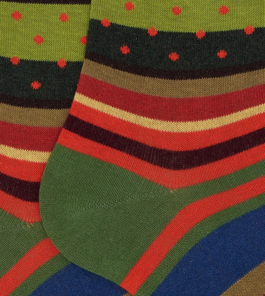 Calze da uomo realizzate in Italia in cotone. Morbidissimi, sono pensati per chi รจ esuberante e non rinuncia a dettagli di stile. Le divertenti righe, i pois e le sfumature di verde li rendono originali ma riconoscibili. Ideali per look casual, stravaganti o anche formali.