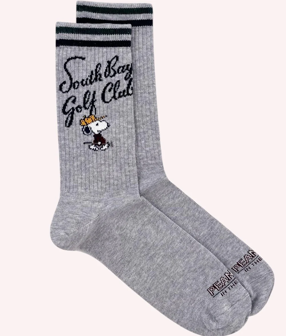 Calze unisex in cotone grigio melange con ricamo esclusivo di Snoopy in versione golfista e scritta โSouth Bay Golf Clubโ in stile script. Rifinite con doppia riga decorativa sul polsino, aggiungono un tocco sportivo e retrรฒ al tuo outfit. Sul piede รจ presente la firma โPEANUTS x IN THE BOXโ, che evidenzia la collaborazione speciale. Realizzate in morbido misto cotone, offrono comfort, elasticitร e resistenza per lโuso quotidiano o lโattivitร sportiva leggera.lโuso quotidiano.