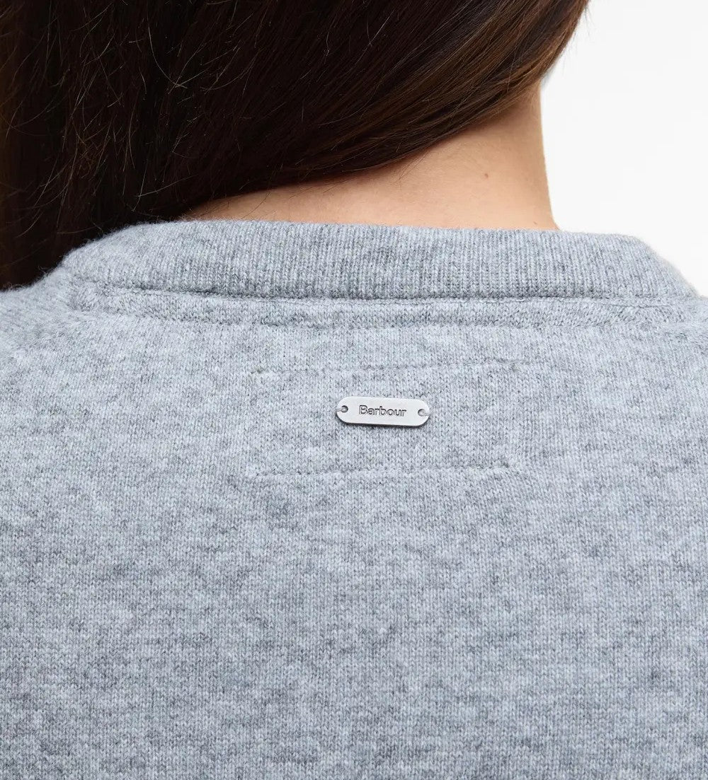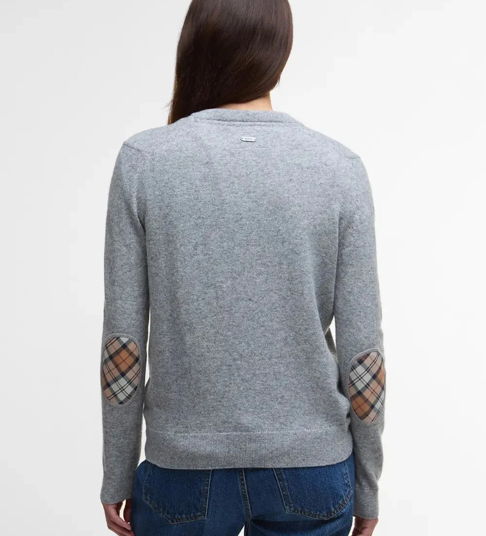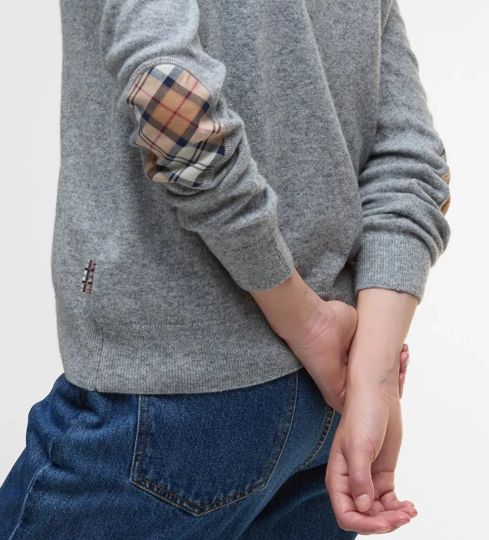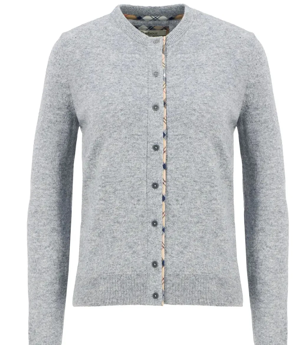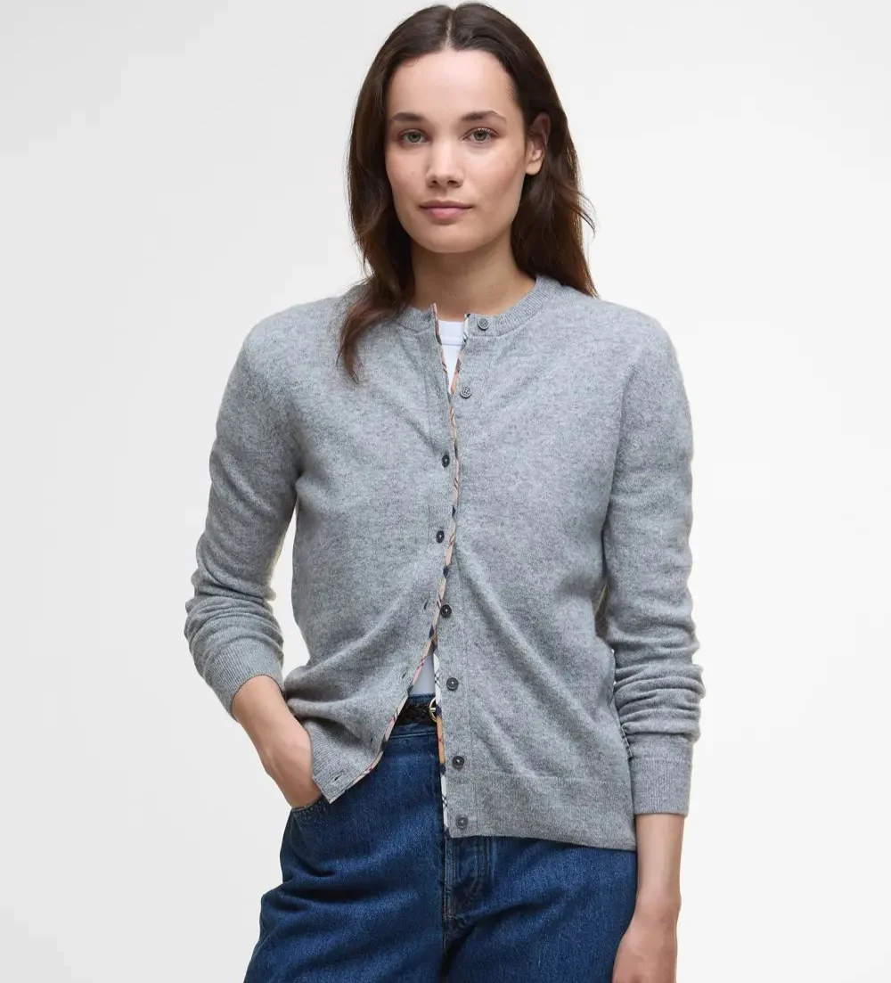 Cardigan donna grigio realizzato in misto lana con finiture in tartan sul retro del collo, sull’abbottonatura e sulle toppe sui gomiti.