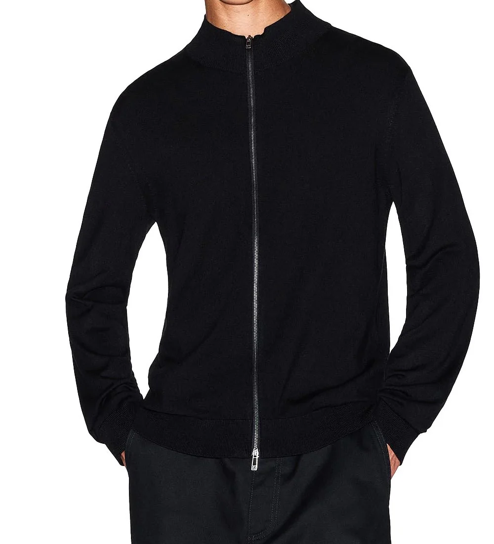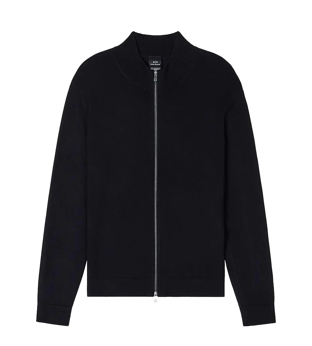 Cardigan uomo nero in viscosa, dal design classico e raffinato, perfetto per l’uso quotidiano e le mezze stagioni. Cratterizzato da un design in maglia con chiusura frontale con zip a doppio cursore, collo alto a coste, maniche lunghe, con polsini e fondo a coste.