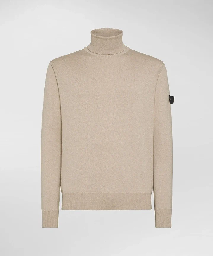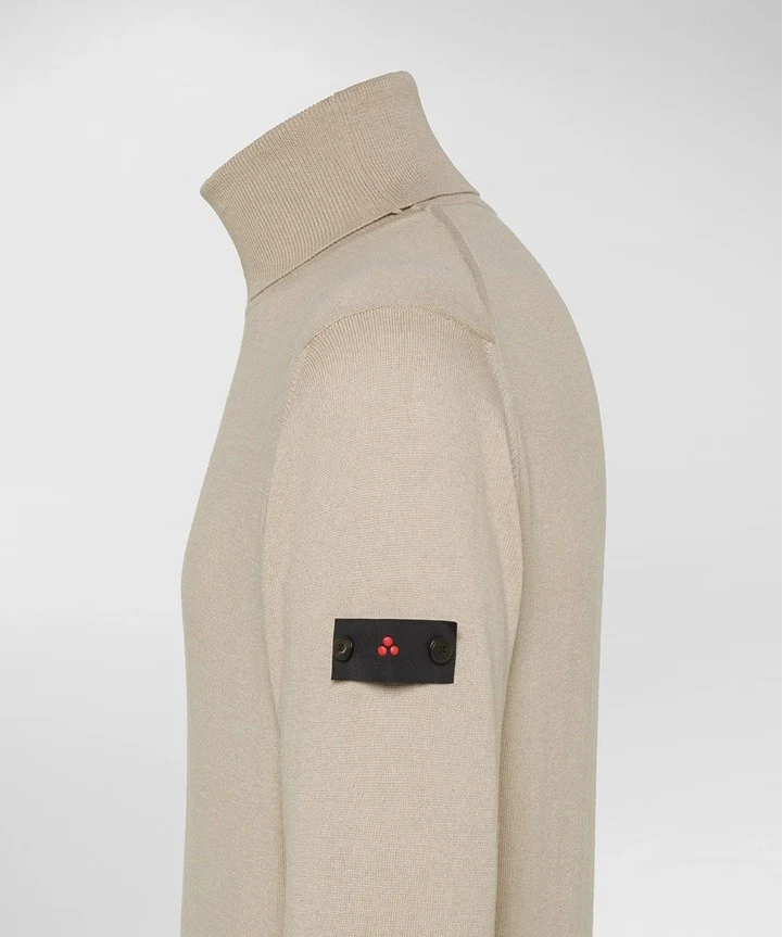 Dolcevita uomo beige in tricot misto lana e cotone, caratterizzato da una texture morbida e compatta. Il design essenziale รจ arricchito dal collo alto e dai dettagli a coste su polsini, bordo e collo, che garantiscono una vestibilitร confortevole e un look curato. Modello tinta unita disponibile in vari colori. Sul braccio sinistro รจ applicata con due delicati bottoncini la personalizzazione con logo Peuterey trilogy, simbolo iconico del brand. Il capo perfetto per proteggersi dal freddo senza rinunciare ad uno stile classico ed elegante.