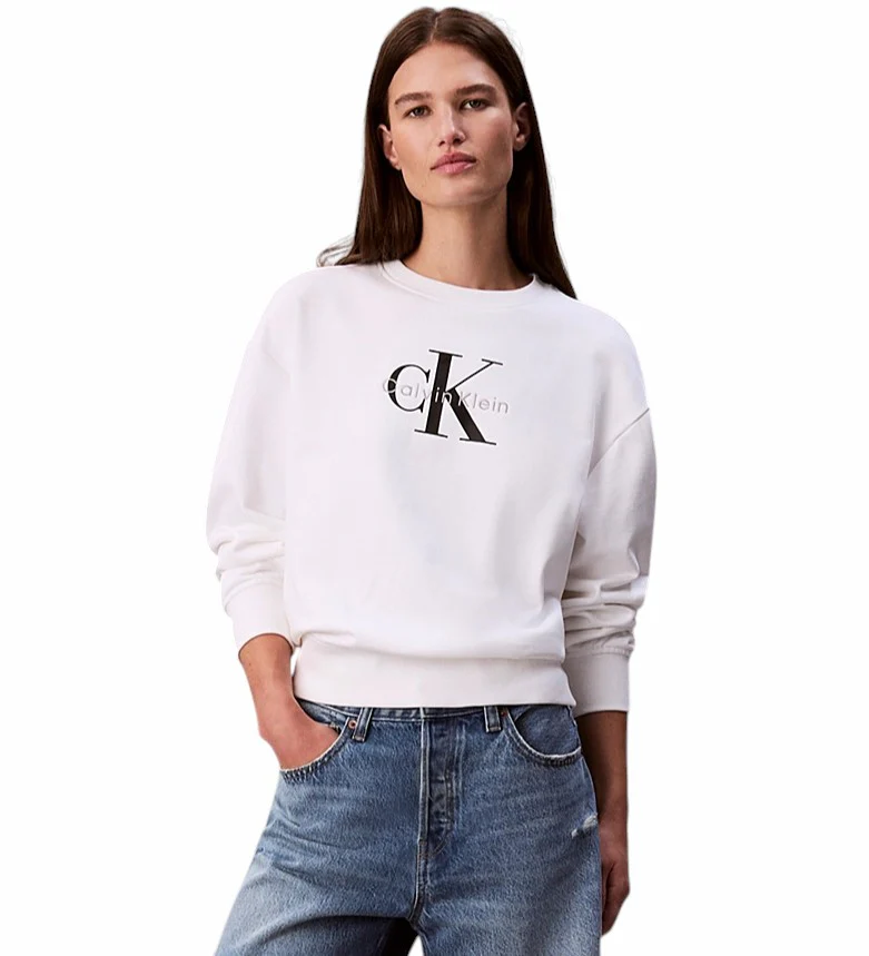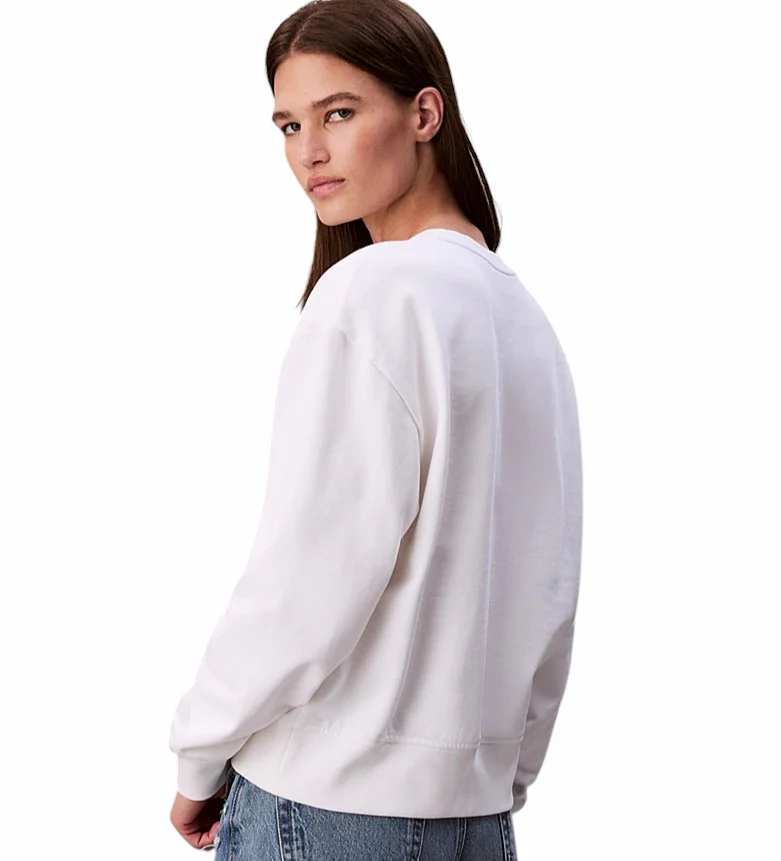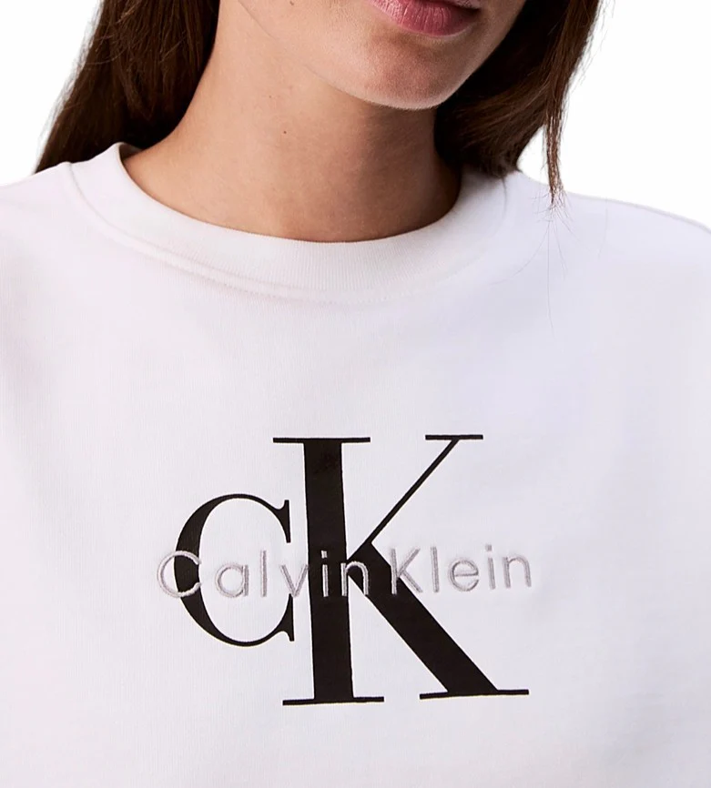 Felpa donna bianca realizzata in spugna misto cotone, modello corto, dal taglio squadrato e rilassato, girocollo con stampa logo e ricamo sul petto.