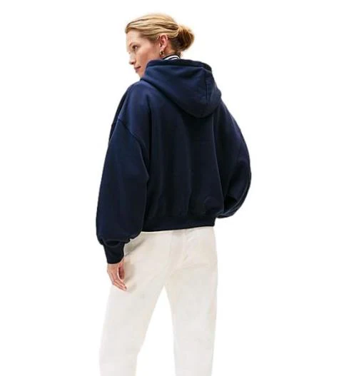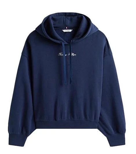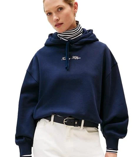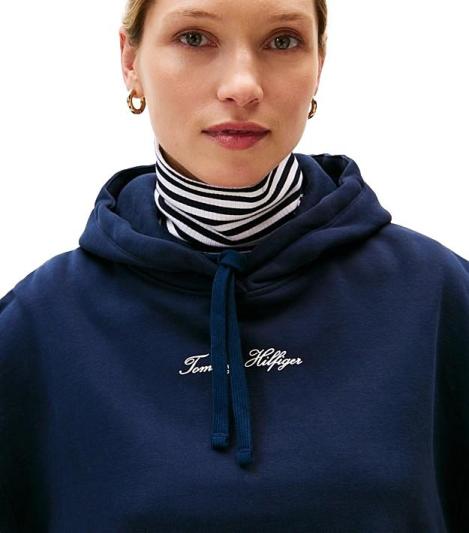 Felpa donna blu scuro in tessuto flex di misto cotone, dalla vestibilitร rilasstata, con cappuccio e impreziosita da un sofisticato logo in corsivo con effetto 3D, bandierina ricamata sulla manica