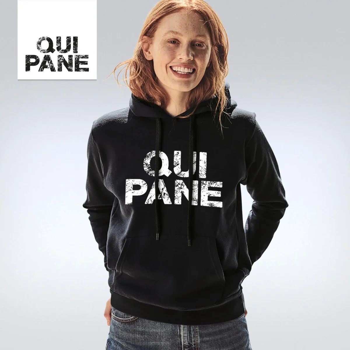 Felpa da donna ” QUI PANE ” dal taglio moderno e sportivo in misto cotone-poliestere di media pesantezza, con cappuccio e tasca anteriore a marsupio; maniche set-in e cordoncino largo.