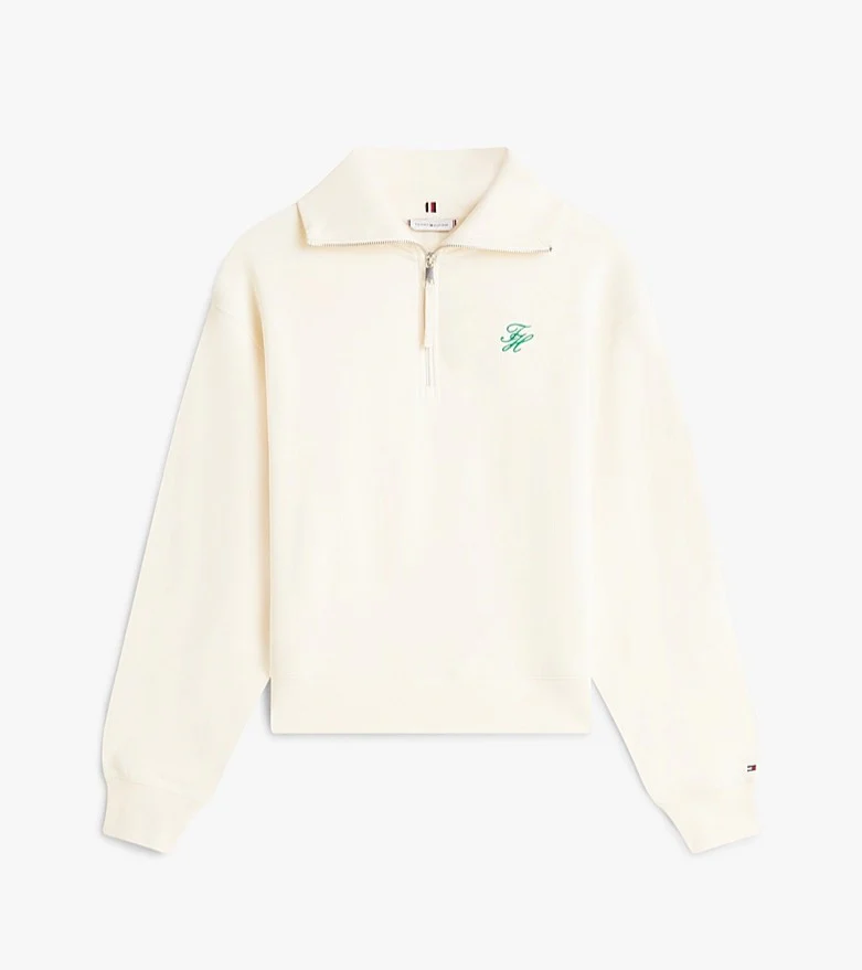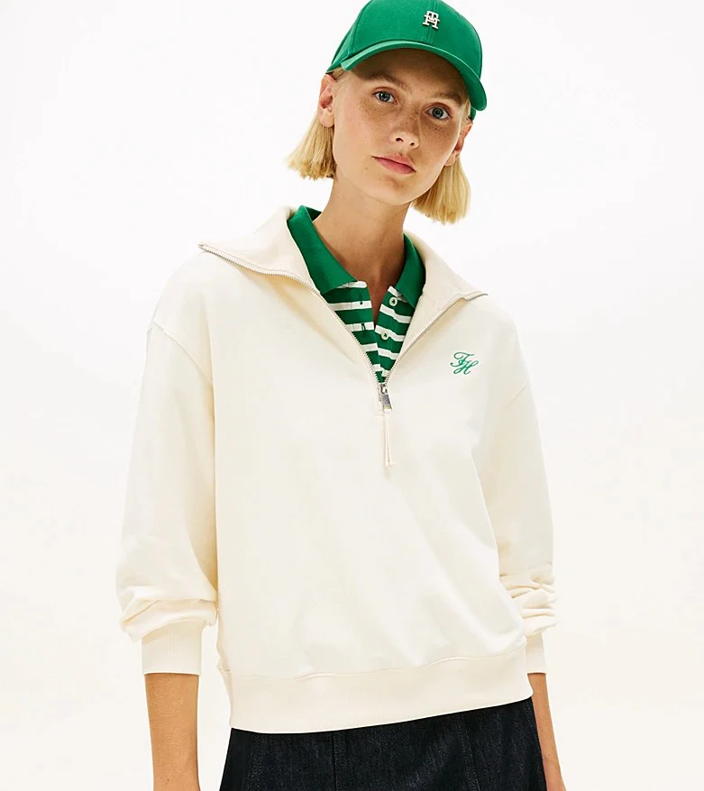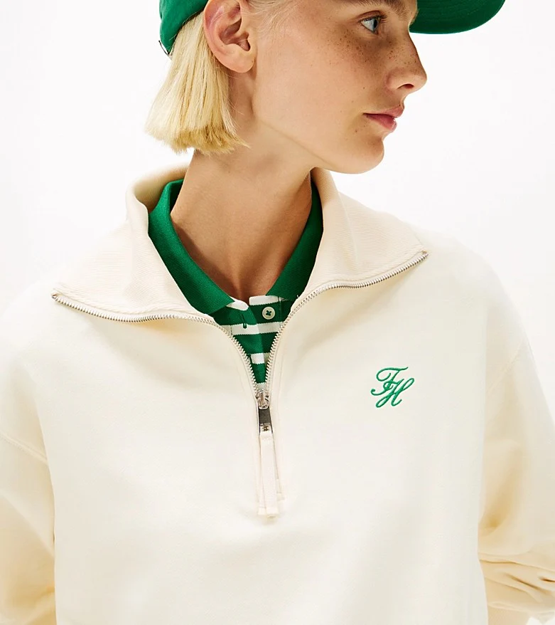 Felpa donna crema realizzata in spugna di misto cotone stretch. Modello dal design con mezza zip e colletto oversize che aggiunge un tocco contemporaneo, vestibilitร regolare e spalle scese, con logo in corsivo sul petto.
