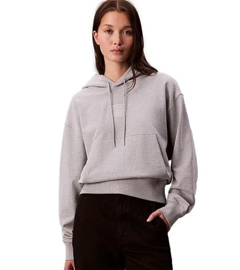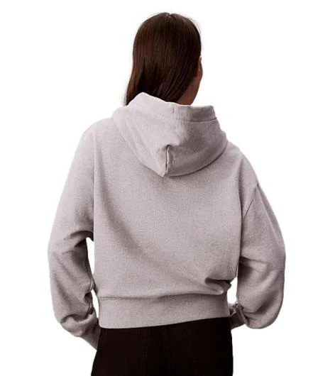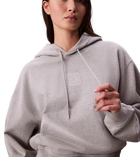 Felpa donna grigia in misto cotone, dotata di cappuccio con coulisse e tasca a marsupio, polsini e orlo a costine. Vestibilitร regolare.
