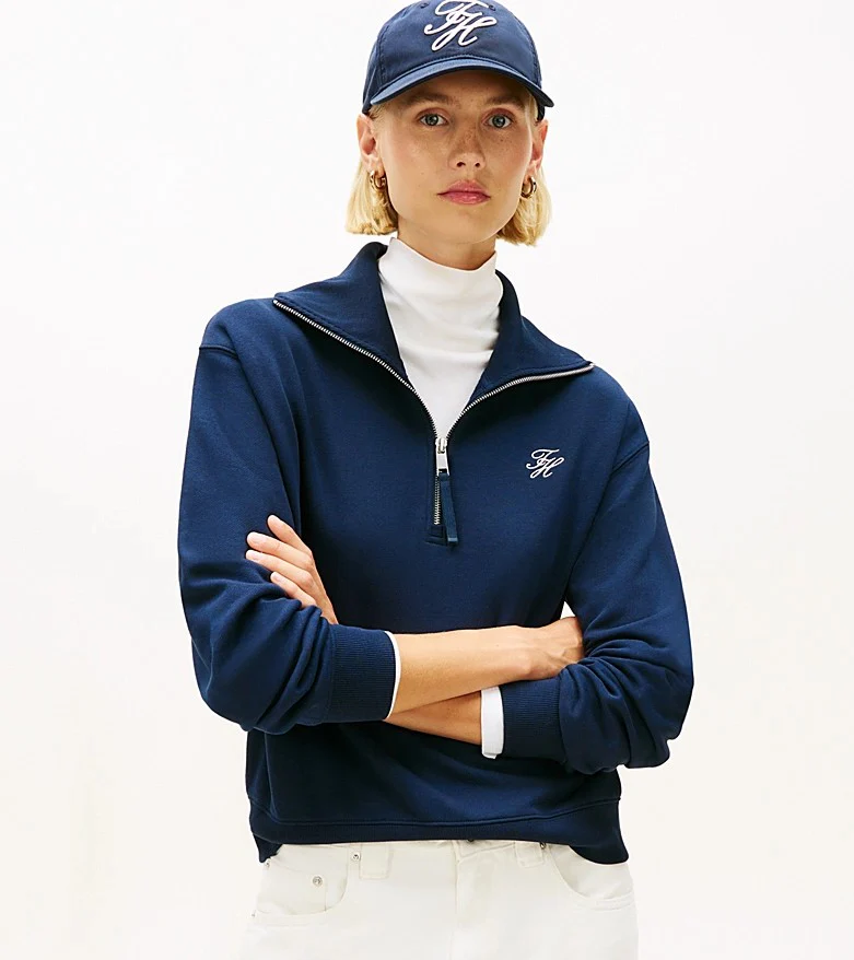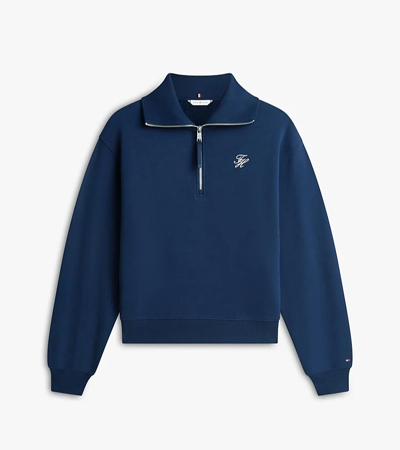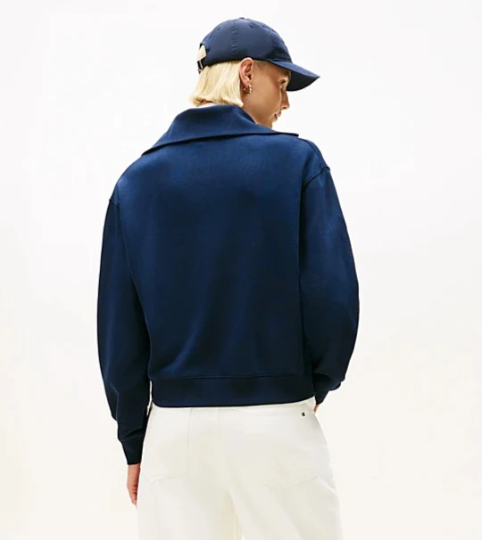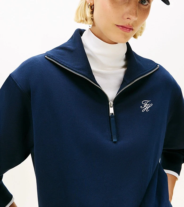 Felpa donna navy realizzata in spugna di misto cotone stretch. Modello dal design con mezza zip e colletto oversize che aggiunge un tocco contemporaneo, vestibilitร regolare e spalle scese, con logo in corsivo sul petto.