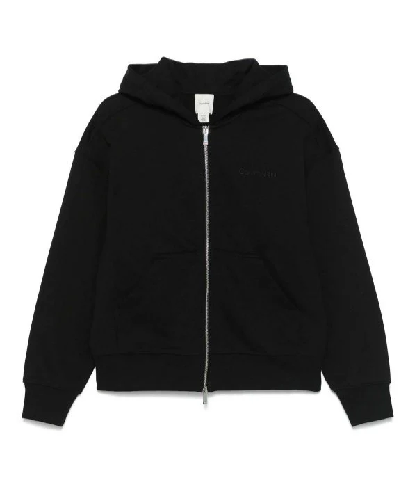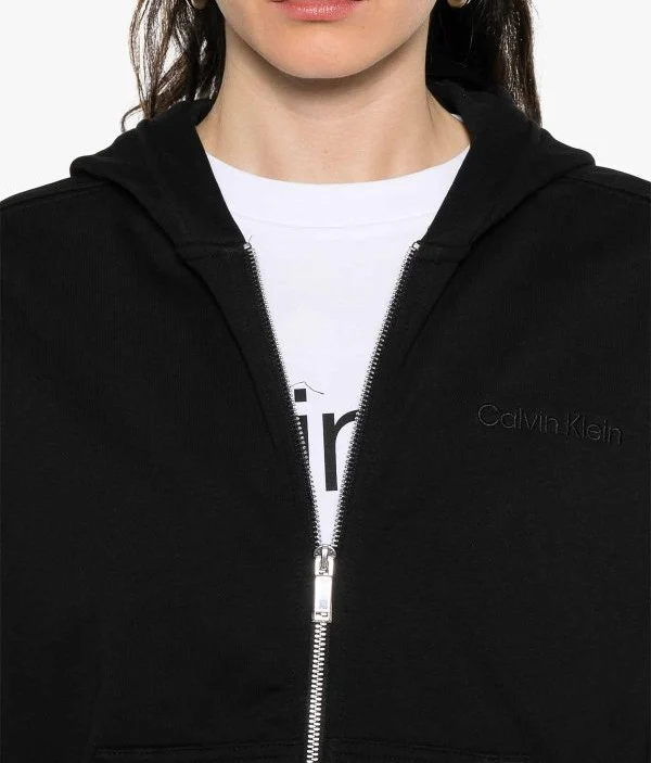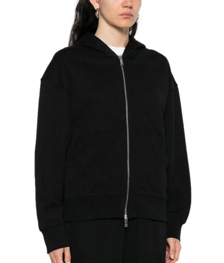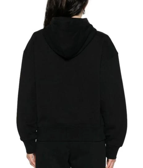 Felpa donna nera in cotone, con cappuccio e zip, con spalle scese, tasche marsupio e orli a coste, logo sul petto tono su tono.