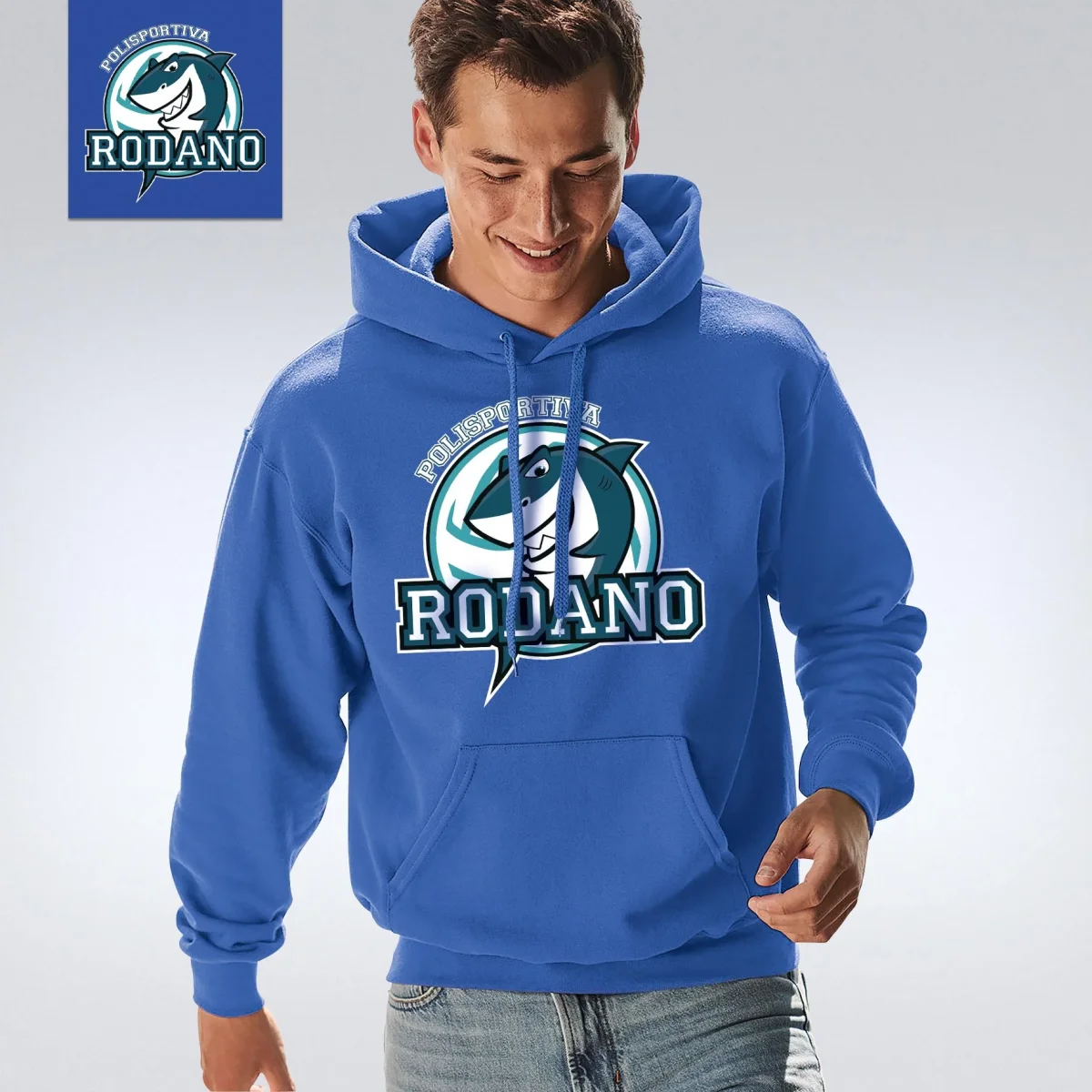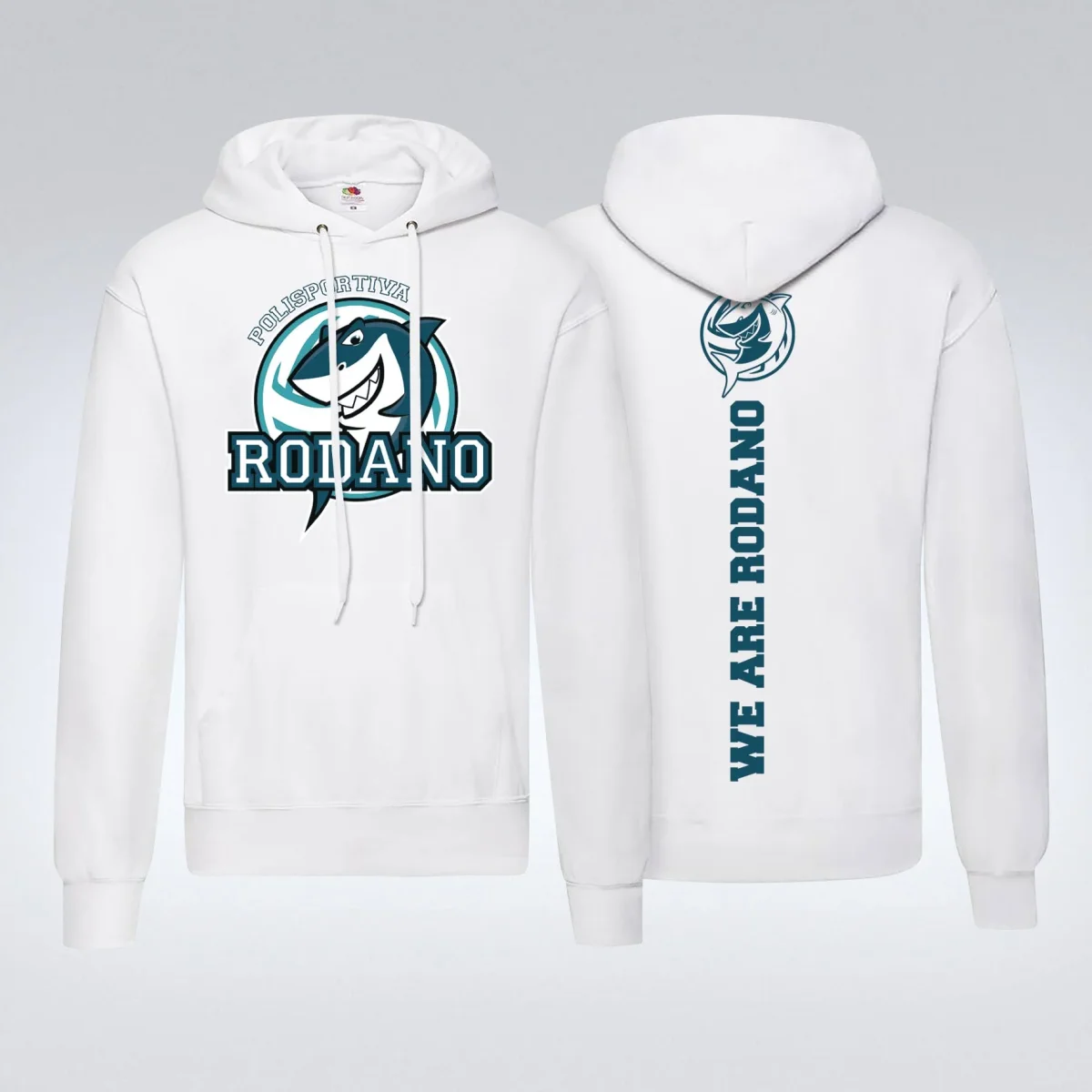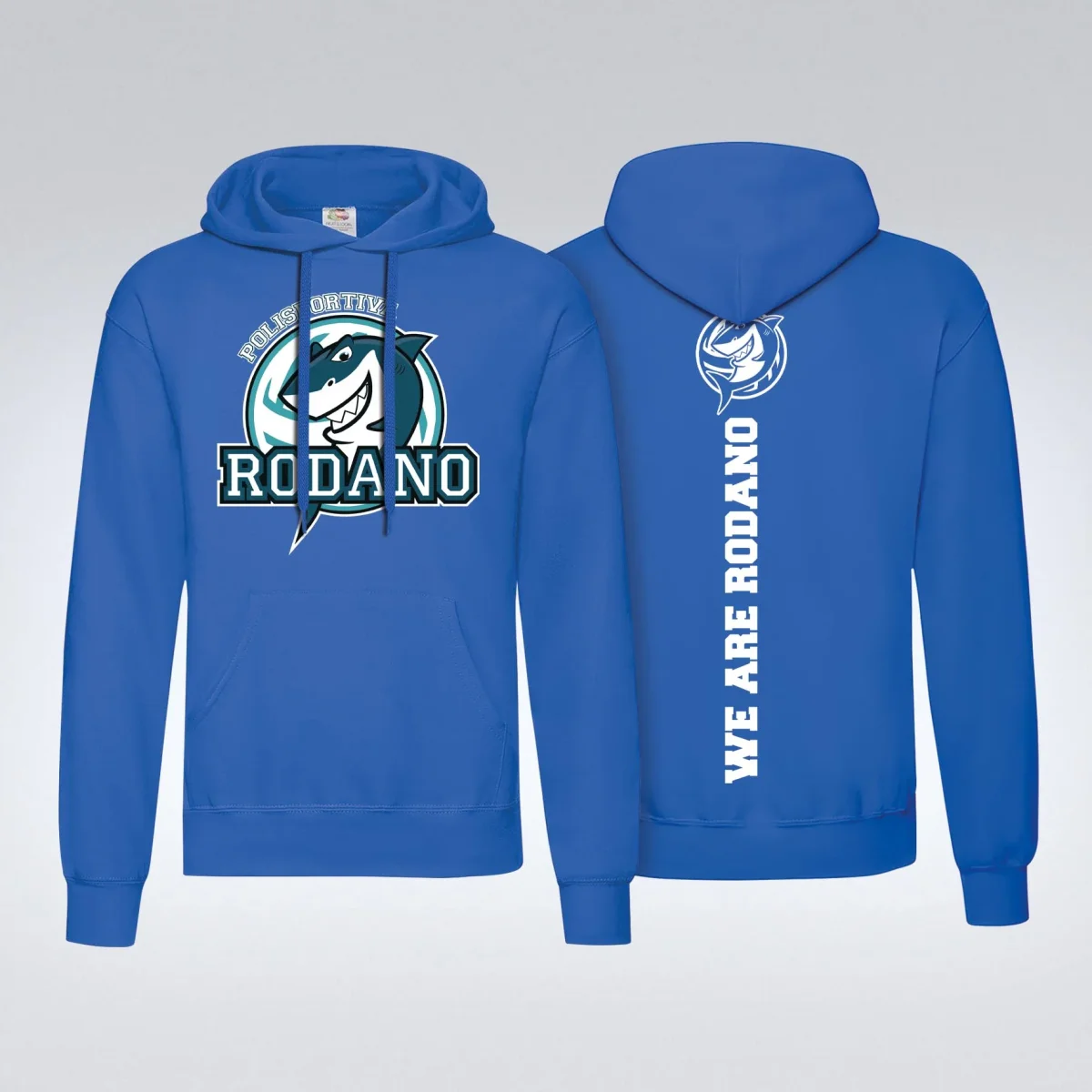 Felpa unisex ufficiale Polisportiva Rodano dal taglio moderno e sportivo in misto cotone-poliestere di media pesantezza, con cappuccio e tasca anteriore a marsupio; maniche set-in e cordoncino largo.