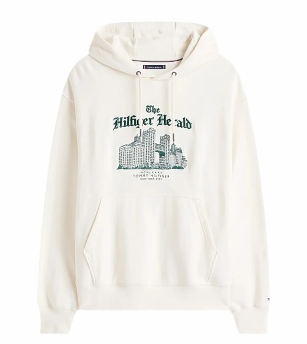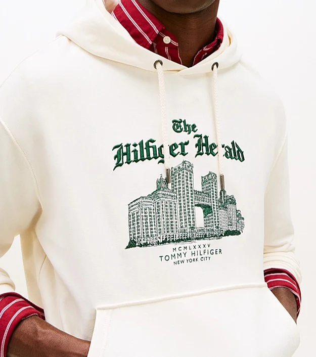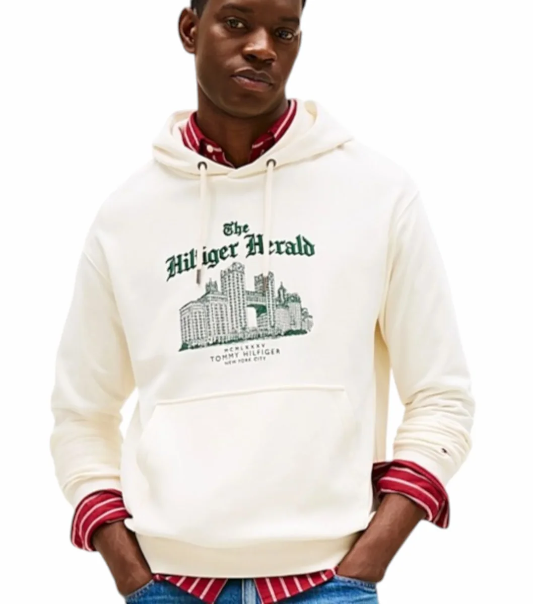 Felpa uomo avorio in spugna di puro cotone, con cappuccio e lacci, tasca a marsupio, estremitร dei lacci con branding, esclusivo logo NYC ricamato sul petto, bandierina ricamata sulla manica. Vestibilitร rilassata, spalle scese.