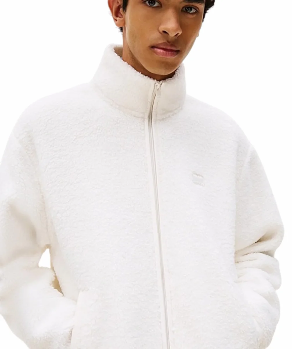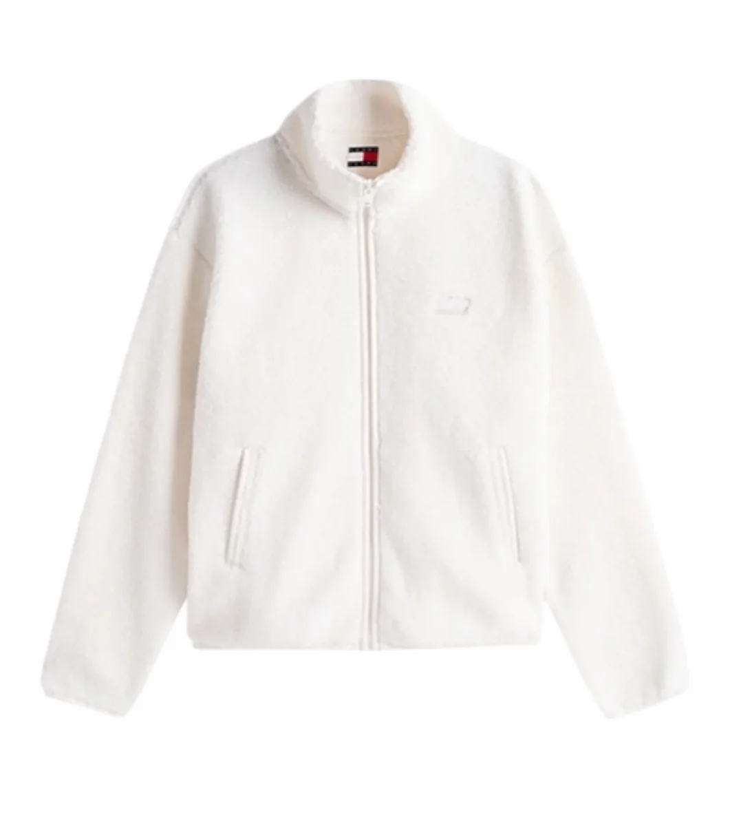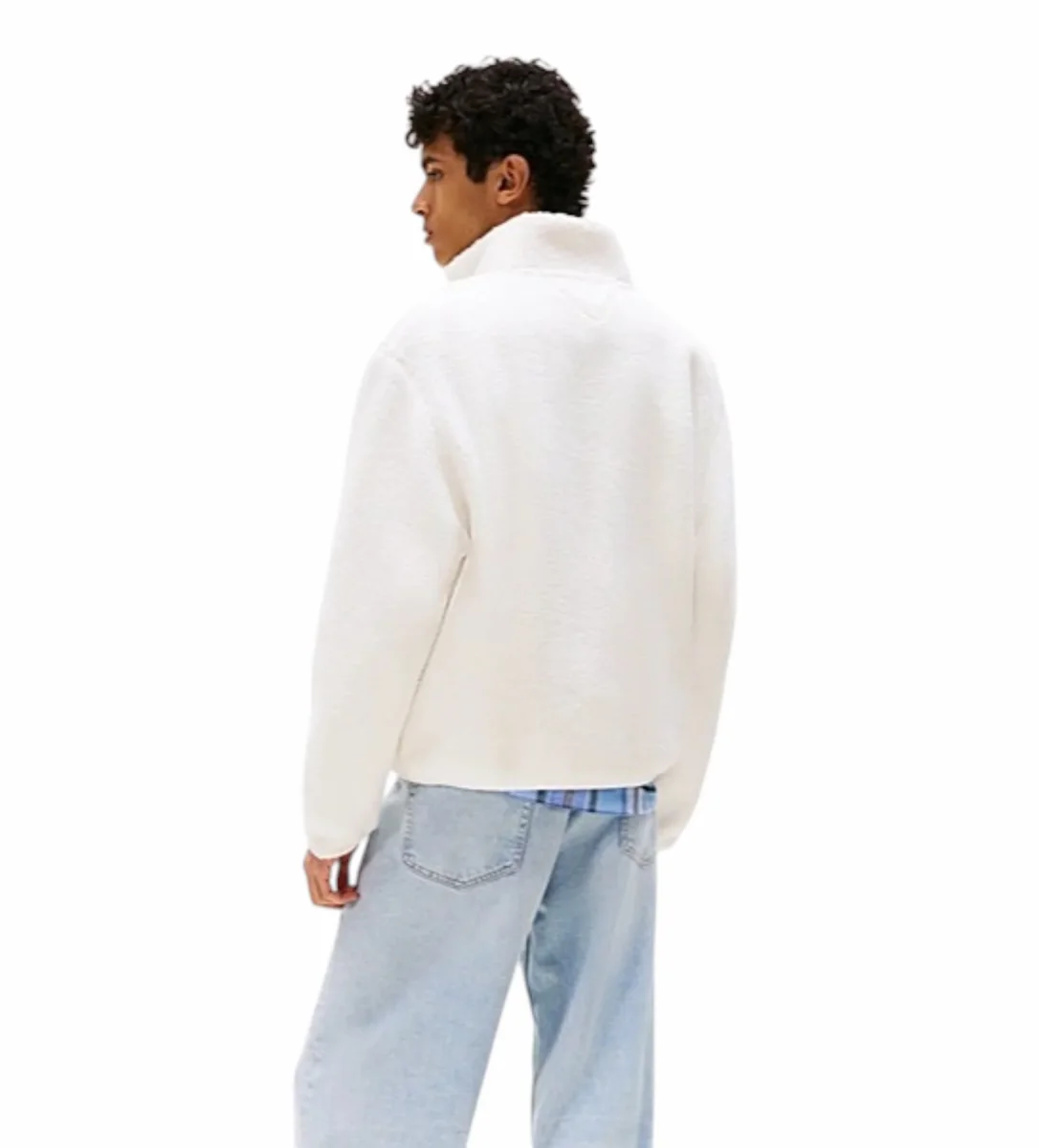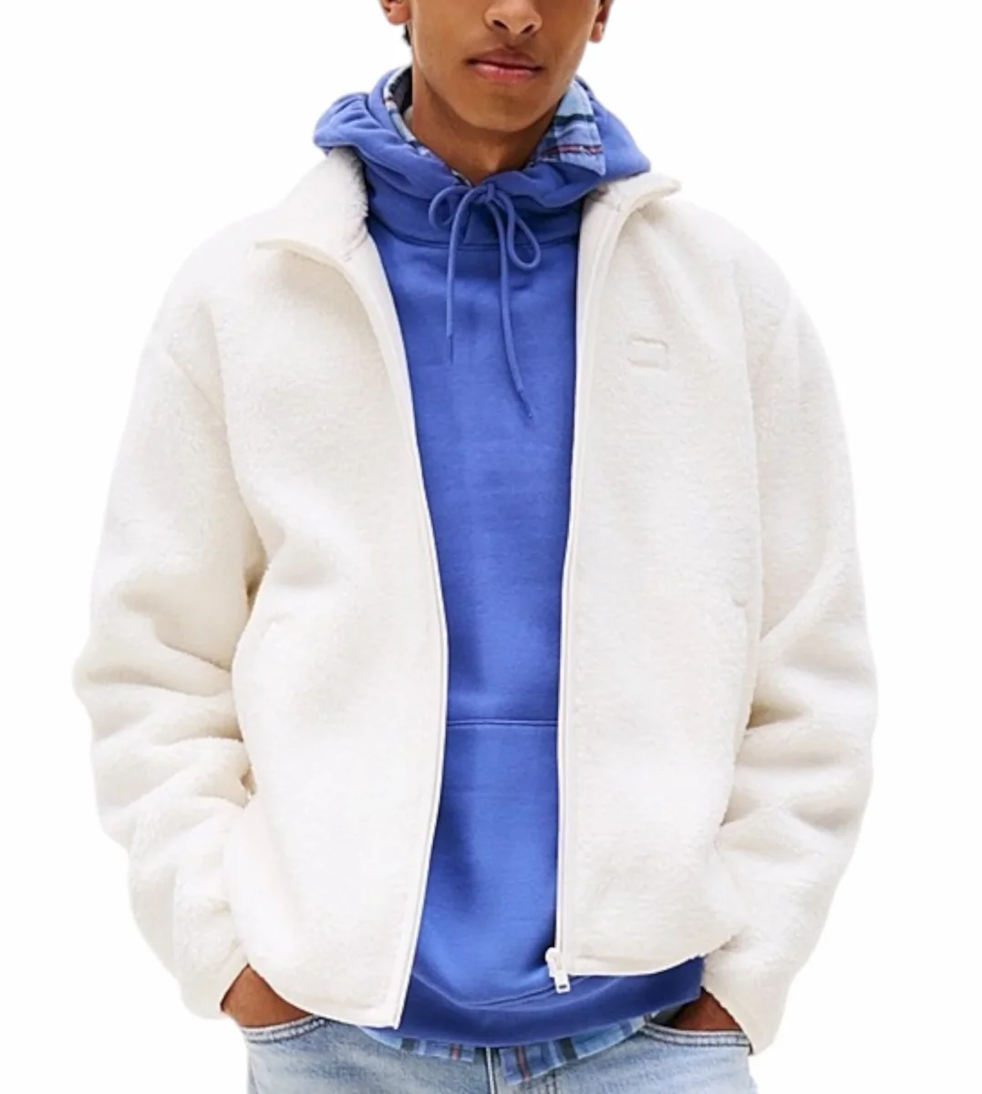 Felpa uomo bianca relaxed fit in sherpa, con zip integrale, tasche a filetto in vita, collo a imbuto e distintivo Tommy tono su tono sul petto, รจ un capo morbido e avvolgente.