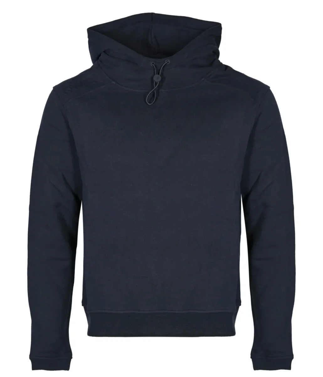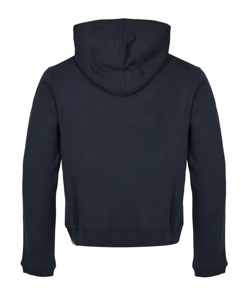Felpa uomo blu realizzata in misto cotone e cashmere, con dettaglia a costine, cappuccio regolabile con coulisse e logo sulla spalla.