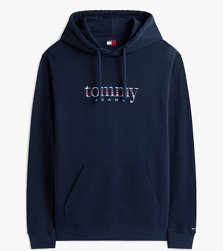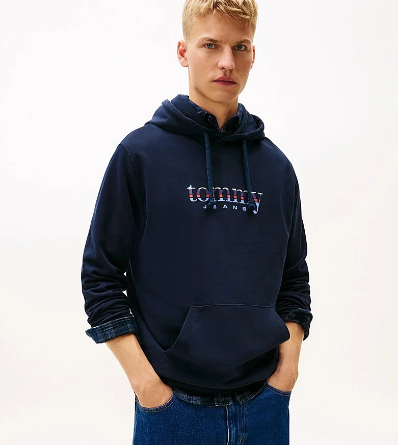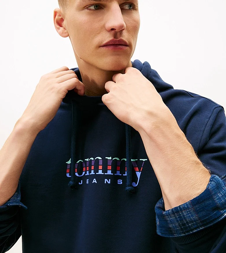 Felpa uomo blu in spugna di puro cotone, dotata di cappuccio con lacci e tasca a marsupio e logo stampato sul davanti.
