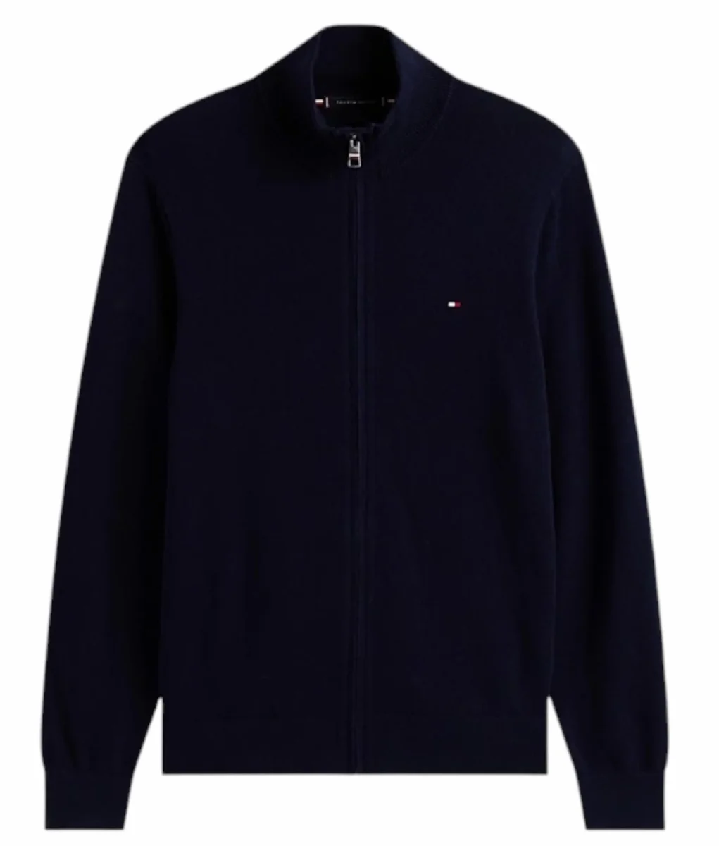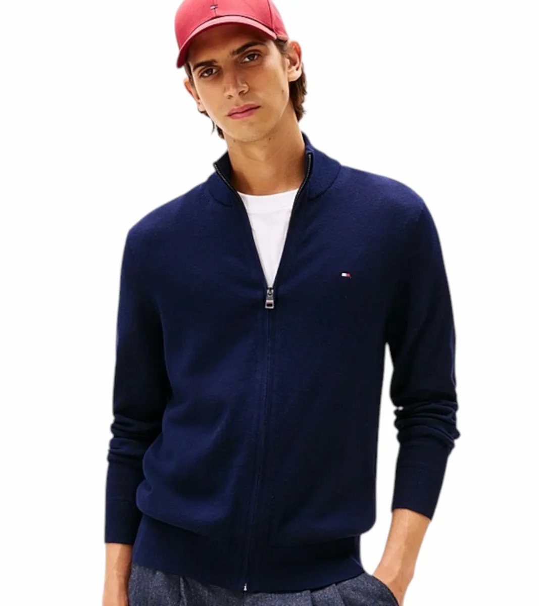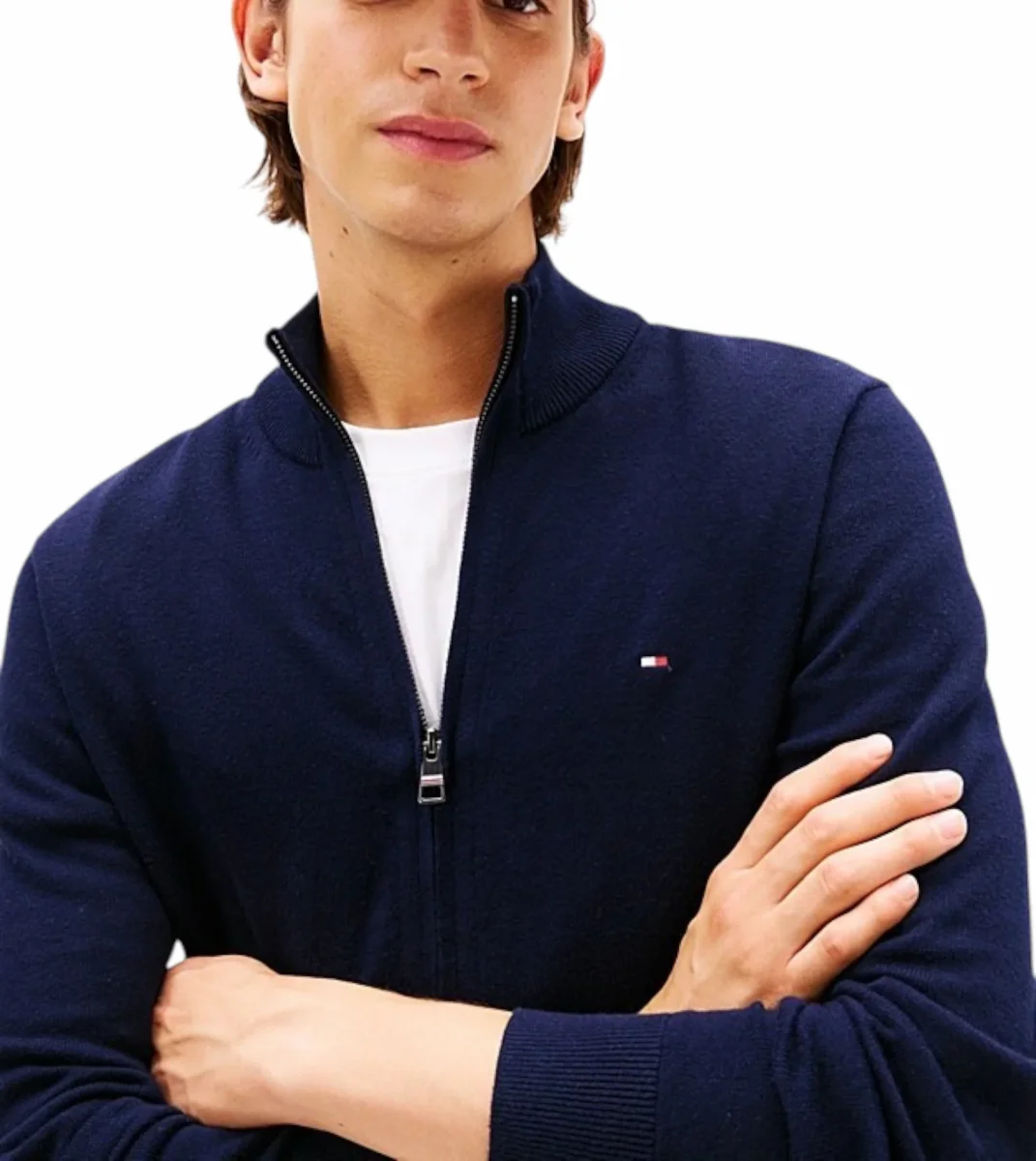 Felpa uomo blu navy realizzata in morbido misto cotone pima e cashmere. Caratterizzata da chiusura con zip frontale, collo a lupetto, collo, polsini e fondo a coste, dettaglio iconico sul tiretto della zip e bandierina ricamata sul petto. Vestibilitร regolare.