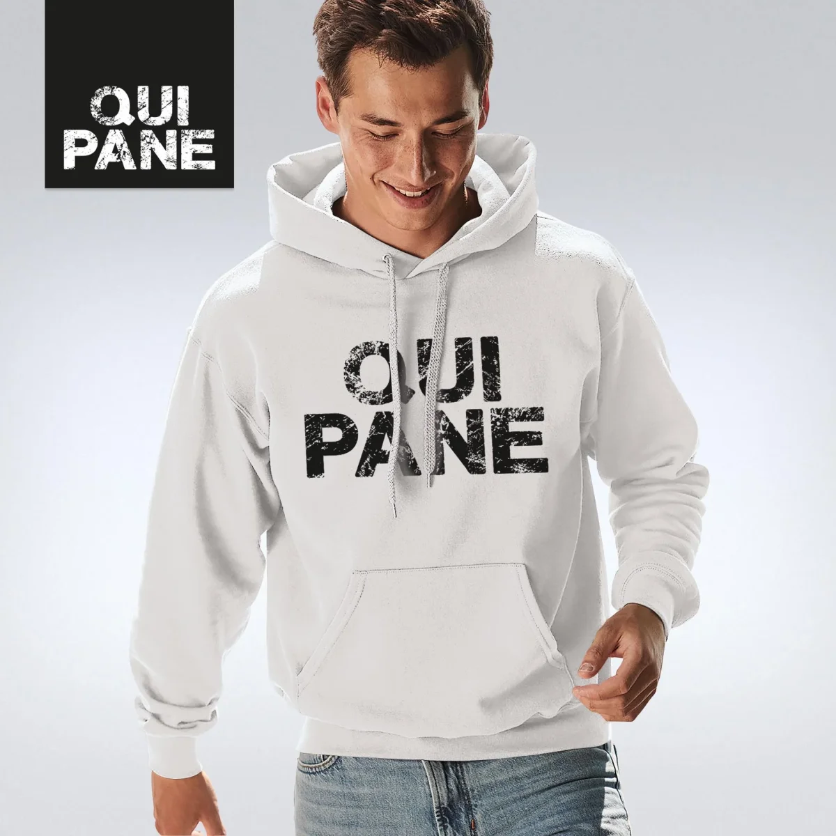 Felpa da uomo ” QUI PANE ” dal taglio moderno e sportivo in misto cotone-poliestere di media pesantezza, con cappuccio e tasca anteriore a marsupio; maniche set-in e cordoncino largo.