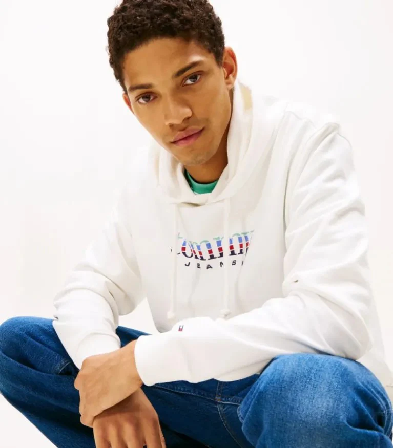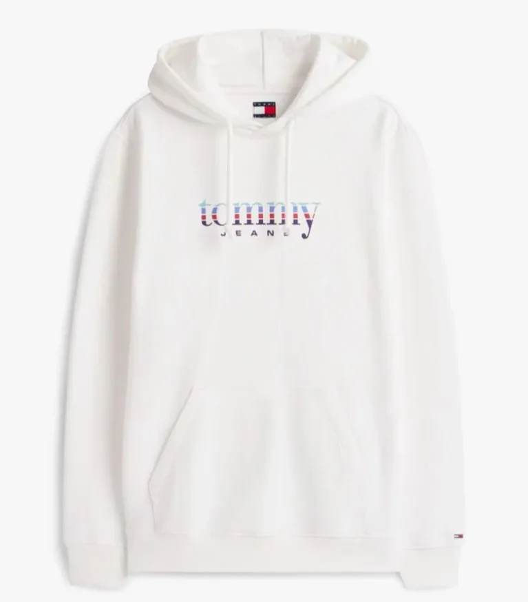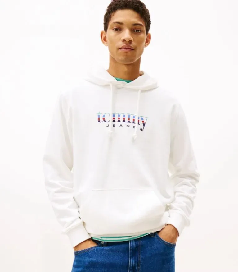 Felpa uomo ecru’ in spugna di puro cotone, dotata di cappuccio con lacci e tasca a marsupio e logo stampato sul davanti.
