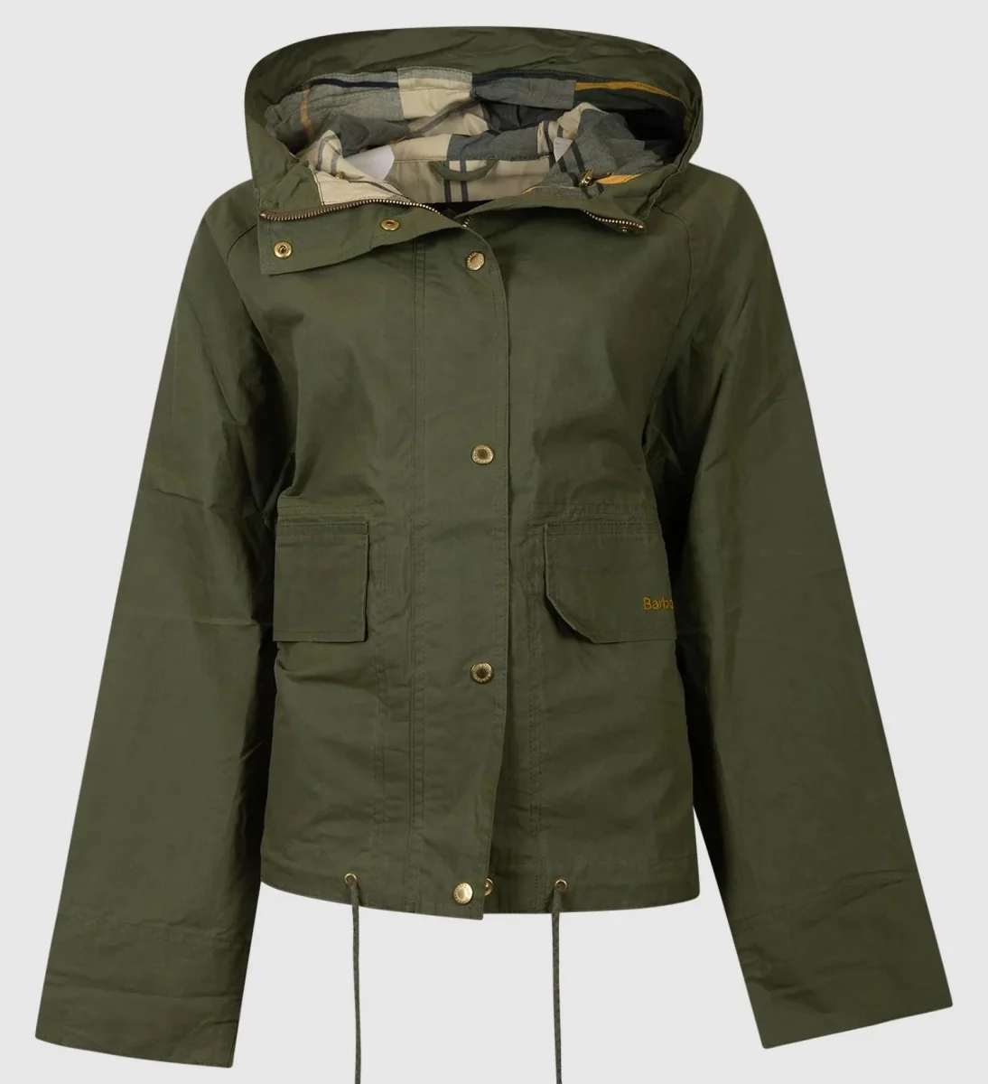 Giacca antipioggia donna verde in cotone, dalla silhouette corta e squadrata e da una costruzione leggera e non foderata, con cappuccio da snorkeling e coulisse sull’orlo, questa giacca รจ rifinita con una chiusura frontale con cerniera e bottone automatico e pratiche tasche una con logo ricamato con patta. Vestibilitร regolare.