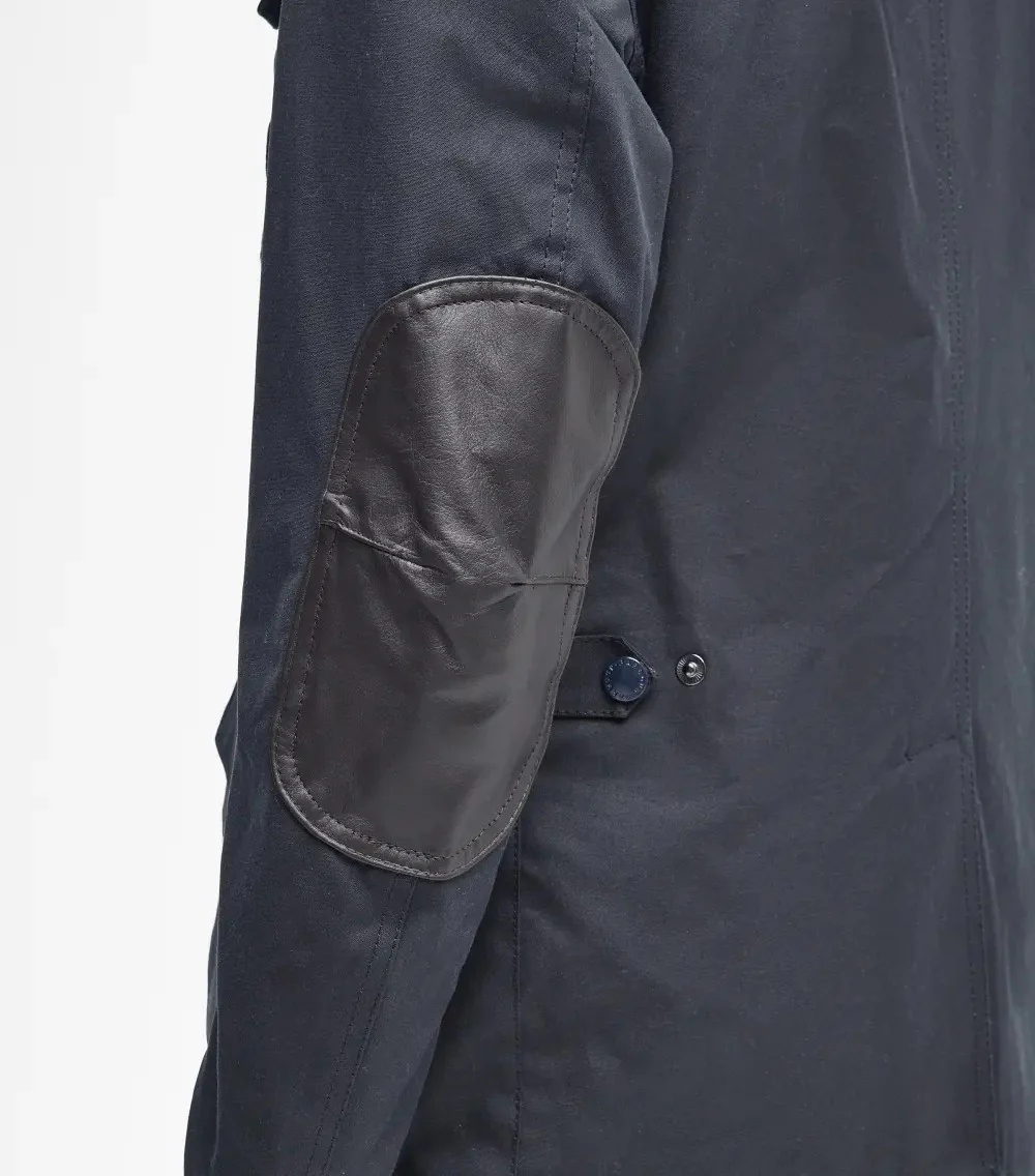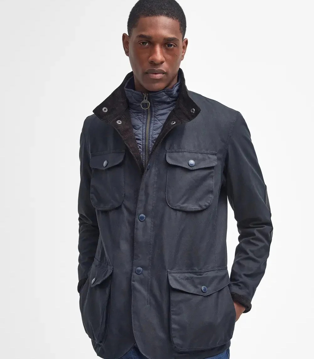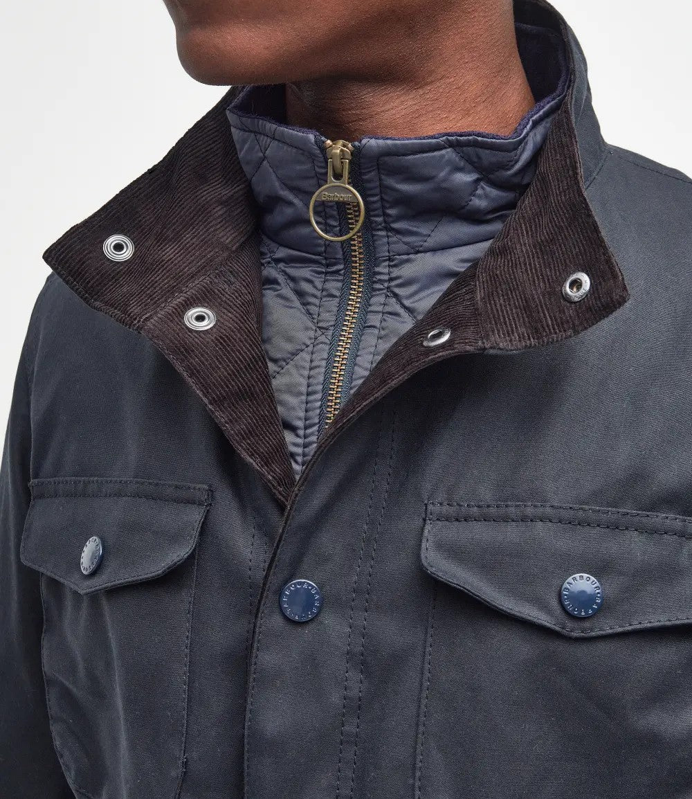 Giacca uomo blu navy elegante e raffinata, รจ un capo robusto, dal taglio maschile e rilassato, realizzato in cotone cerato, che offre una solida protezione dalle intemperie con una finitura opaca effetto camoscio. Il gilet trapuntato integrato crea un look outdoor e offre un ulteriore strato di calore, chiudendosi fino al collo alto con una zip con logo. La giacca esterna aggiunge ulteriore praticitร  con robuste chiusure a bottone e quattro ampie tasche, oltre a dettagli distintivi come toppe in pelle sui gomiti e rivestimenti in velluto a coste. La lussuosa fodera aggiunge un tocco di eleganza e raffinatezza a questa robusta giacca invernale.