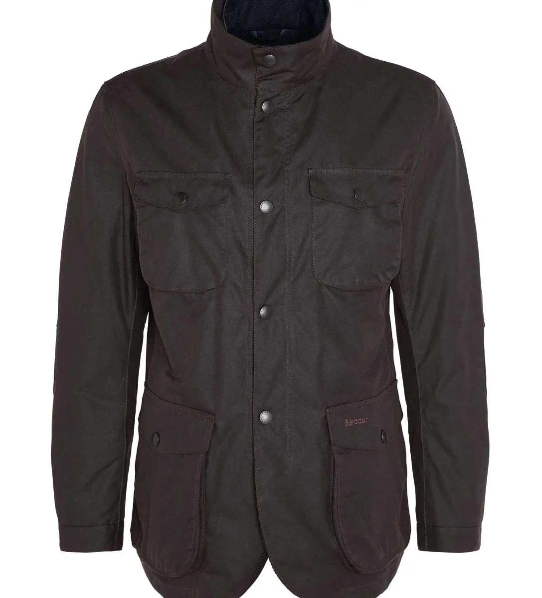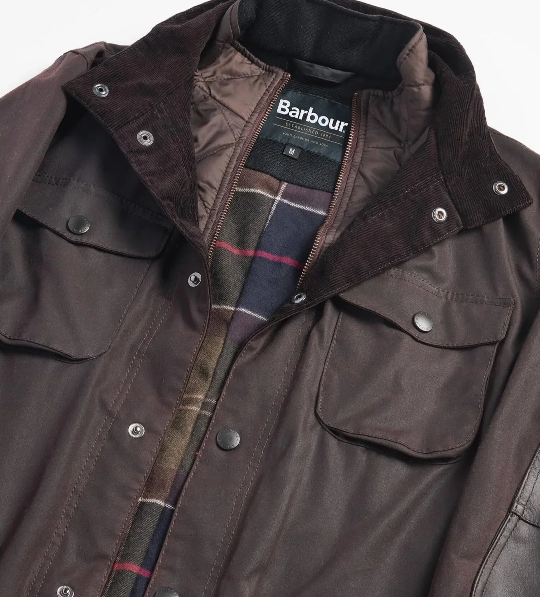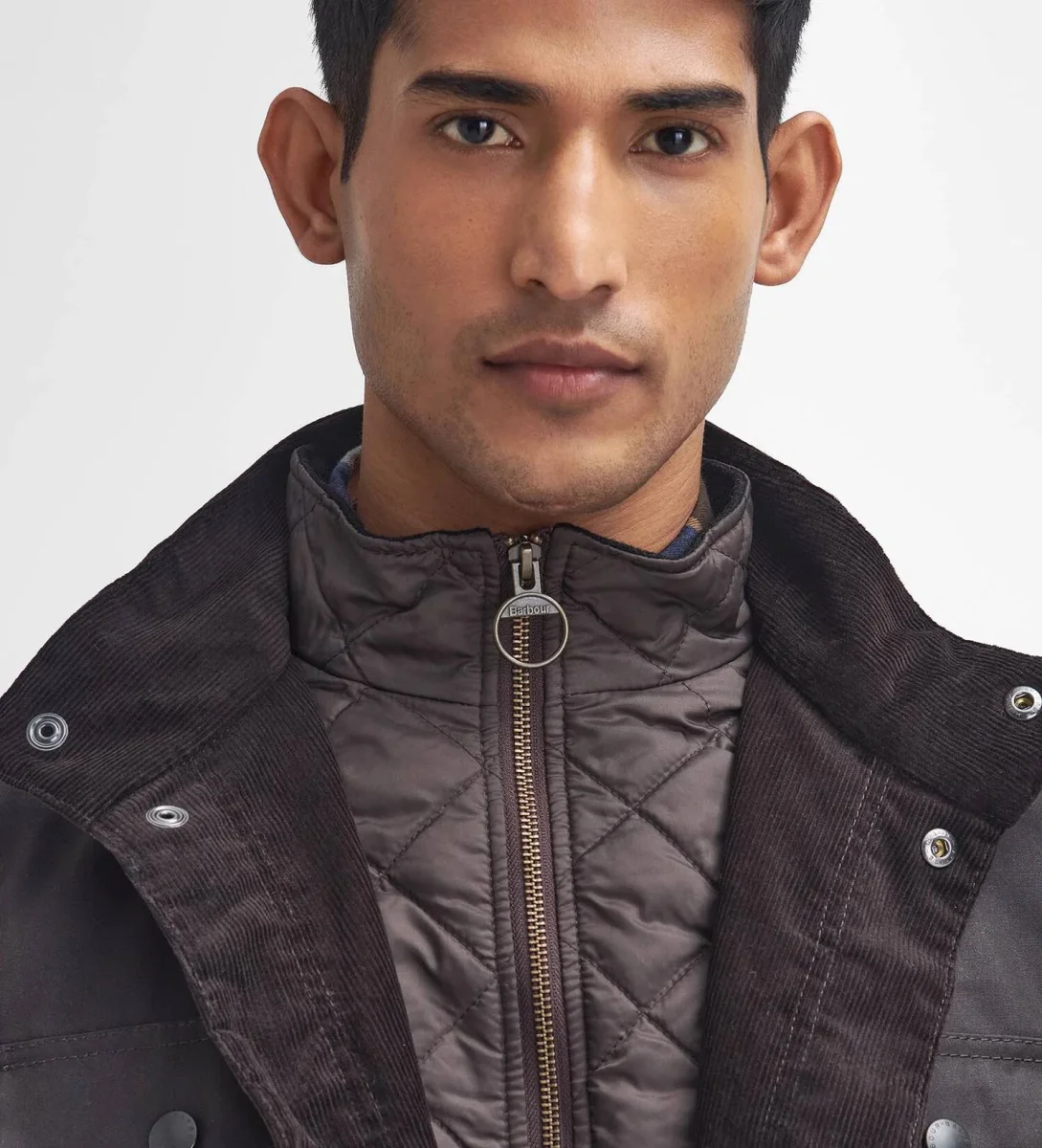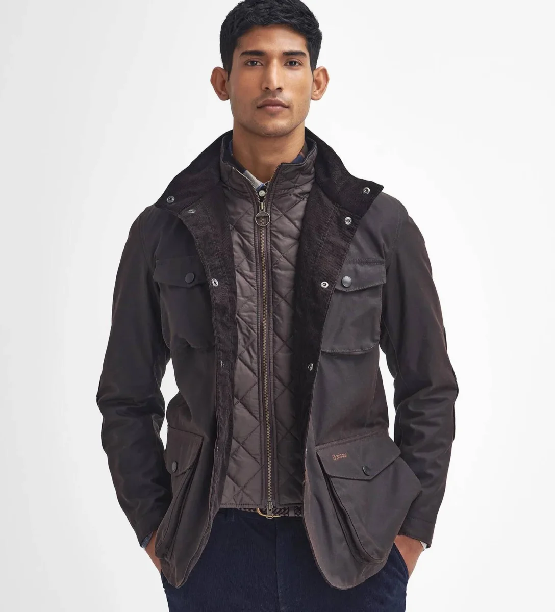 Giacca uomo marrone elegante e raffinata, รจ un capo robusto, dal taglio maschile e rilassato, realizzato in cotone cerato, che offre una solida protezione dalle intemperie con una finitura opaca effetto camoscio. Il gilet trapuntato integrato crea un look outdoor e offre un ulteriore strato di calore, chiudendosi fino al collo alto con una zip con logo. La giacca esterna aggiunge ulteriore praticitร con robuste chiusure a bottone e quattro ampie tasche, oltre a dettagli distintivi come toppe in pelle sui gomiti e rivestimenti in velluto a coste. La lussuosa fodera aggiunge un tocco di eleganza e raffinatezza a questa robusta giacca invernale.