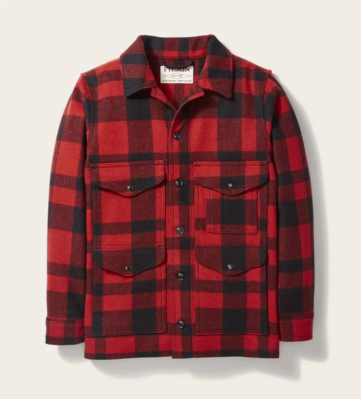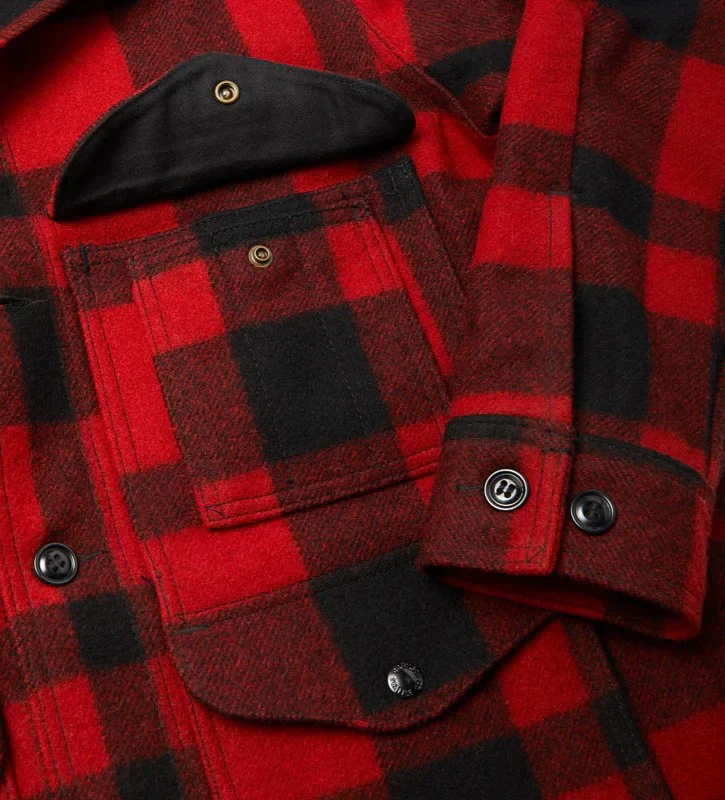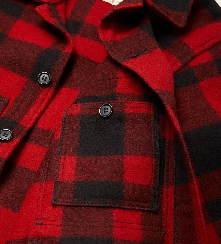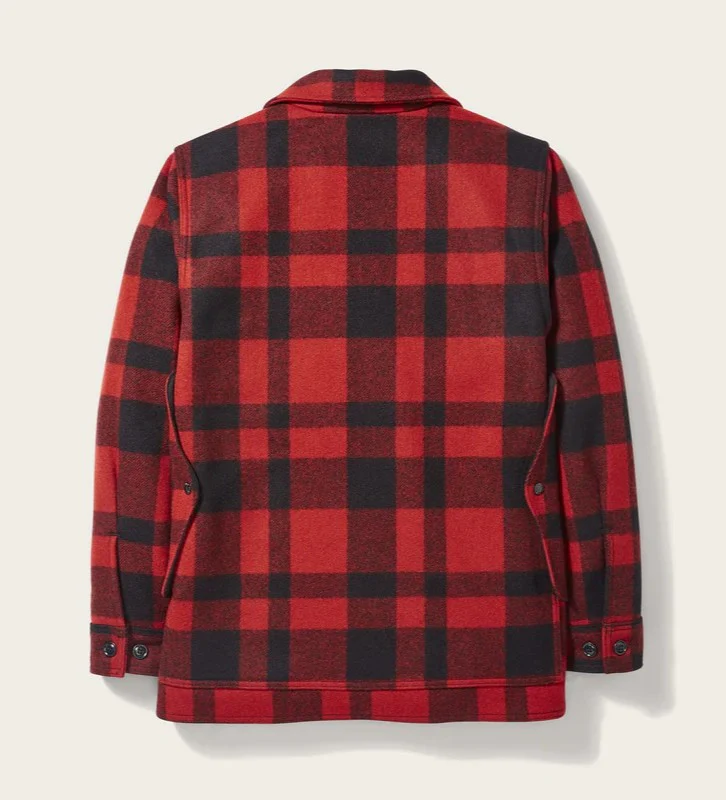 Giacca uomo rossa e nera realizzata in lana, dalla trama fitta, traspirante ma resistente al vento. Modello dalla vestibilitร abbondante, con quattro tasche con patta con bottone automatico sul davanti e una grande tasca per mappe/carte che copre l’intera schiena, due strati di lana coprono la maggior parte del busto, proprio dove รจ necessaria una maggior protezione.